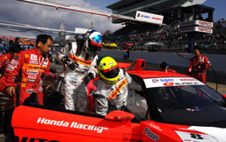 3月18日(土)に開催された公式予選では、決勝グリッドを争うスーパーラップに出場した3台のHonda NSX-GTが力強い走りを見せた。あいにく激しい雨が降るコンディションの中、3番目にタイムアタックを行ったTAKATA童夢NSXの道上龍選手が、それまでのトップタイムを2秒以上も上回る2分7秒489を叩きだしてトップに浮上。その後、タイムアタックを行ったドライバー達は道上選手のタイムをなかなか上回ることができなかったが、最後となる10番目に走行したARTA NSXの伊藤大輔選手が0秒956上回る2分6秒533を記録して見事に開幕戦のポールポジションを獲得した。