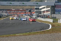 ホールショットは、ポールポジションスタートの#23 XANAVI NISMO GT-R。続いて#32 EPSON NSXのL.デュバル選手がポジションを1つ上げて追走、3位に#1 ARTA NSXのR.ファーマン選手、4位に#18 TAKATA童夢NSXの小暮選手が続く。トップの#23 XANAVI NISMO GT-Rは序盤から1分42秒台の速いペースで走行し、5周終了時で2位の#32 EPSON NSXとのタイム差は4秒626に広がるものの、NSX-GT勢は1分44秒の安定したペースでラップを刻み続ける。