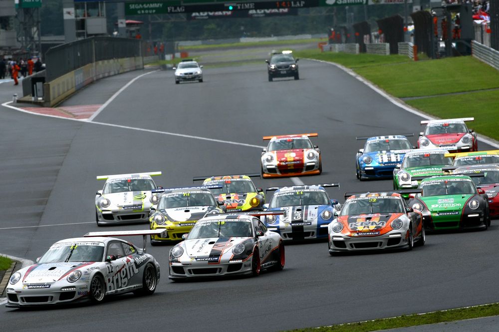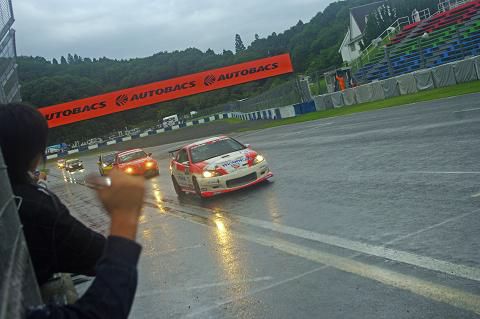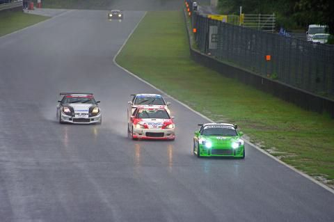 朝から降り続いた雨は、一旦上がりましたが、各車がダミーグリッドにつく頃には、再び雨が降り出します。そんな状況の中、13:30出走台数49台がローリングを開始。今回も、恒例となった2グループによるスタートの為、GT3,ST1/2/3 クラスの第1グループと、ST4/5 クラスの第2グループがそれぞれ隊列を整え、スタートを待ちます。