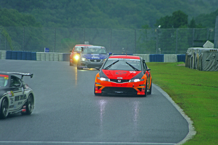 12番グリッドからスタートした#73 mountainインテグラは、トラブルなく順調なスタートをきりますが、レース開始15分で一回目のセーフティカーが導入されます。ライバル陣営の多くは、このタイミングでピットに入り、最初のドライバー交代義務を消化しますが、#73 mountainインテグラは、#116 W.S.ENGINEERING S2000、#88 村上モータースロードスターと共にステイアウトを選択します。16周目にレースが再開されると、#73 mountainインテグラは、#116 W.S.ENGINEERINGとのトップ争いを演じ、34周目についにクラストップに浮上。後方との差を引き離しにかかります。その後も安定したペースで周回を続けた山崎選手は、後方に約90秒のマージンを築き、49周を消化したところで、2番手の森選手と交代します。タイヤは無交換、燃料補給のみでピットアウトした#73 mountainインテグラは、クラストップでコース復帰に成功しますが、ペースに勝る#88 村上モータースロードスター、#58 小林自動車インテグラにかわされてしまい、クラス3位に順位を落とします。