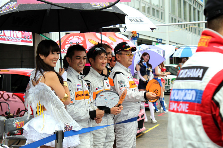 スタートして6周目にクラッシュが発生してSCが入り急遽、奥村選手に交代をして雨の中最後尾から猛追を開始します。奥村選手は決勝レースのファステストタイムを更新しながら毎周秒単位で詰め寄り、2時間を経過する頃には首位の36号車に17秒差まで追いつき、36号車は1度もドライバー交代を行っていない為、事実上クラストップで、最後のドライバーチェンジとガス給油の為、ピットインして奥村選手から再び古宮選手に交代してチェッカーを目指して走り切ります。終盤再び雨が強くなりSCが入る荒れた天気となりましたが、そのまま首位を守りきり、第2戦韓国に続く、ポールトゥウインで岡山戦を終えました。