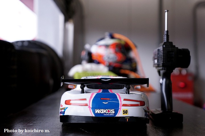 WAKO’S カラーのアストンくんは、油滴をイメージしたものなので曲線が多く、カラーリングとステッカー作りにはたいへん苦労されたそうです。1/10のラジコンボディをスプレーで塗装、ステッカーも既存のものが殆ど無いために、チームから提供されたデータを基に、全てイラストレーターで自作して写真を見ながらサイズ合わせをして貼り付けて仕上げて頂いたのだとか。次戦鈴鹿1000km にも登場してくれますので、是非見に来てくださいね!