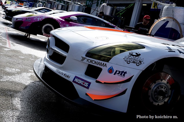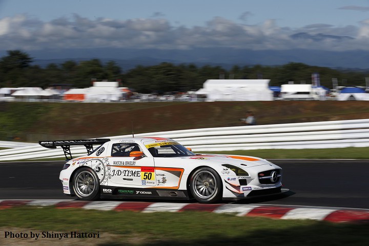 午後になってもまぶしい秋空は変わらず、日差しは強いものの、東北の秋を感じさせる爽やかな天候。予選は午後2時から行われ、Q2進出を目指して安岡選手がアタックを開始した。安岡選手は6Lap目に1'21.085を記録したが、JAF-GT勢とマザーシャーシ勢が上位を占める、今シーズンの流れに食い込んでいくことはできず19位。またしてもQ2進出はお預けとなった。とはいえこの順位は、6台参戦しているMercedes SLS GT3の中で3番目の順位であり、SLSには不向きな菅生のコースにもかかわらず、SKT EXE SLSが健闘したことを窺わせる。躯体の新しくなったマシンはこれまでになくフィーリングが素直になったという両ドライバーの評価に、Arnage Racingは確かな手応えを感じて、翌日の決勝に向けてのメンテナンスを楽しんだ。