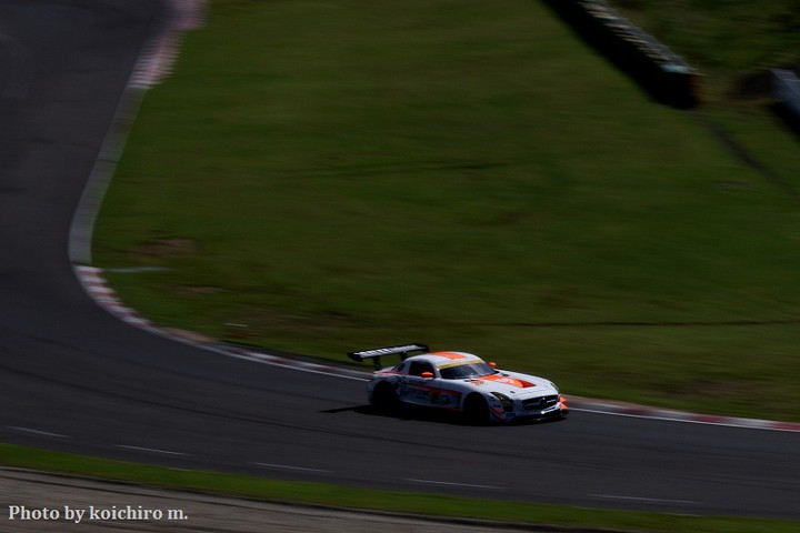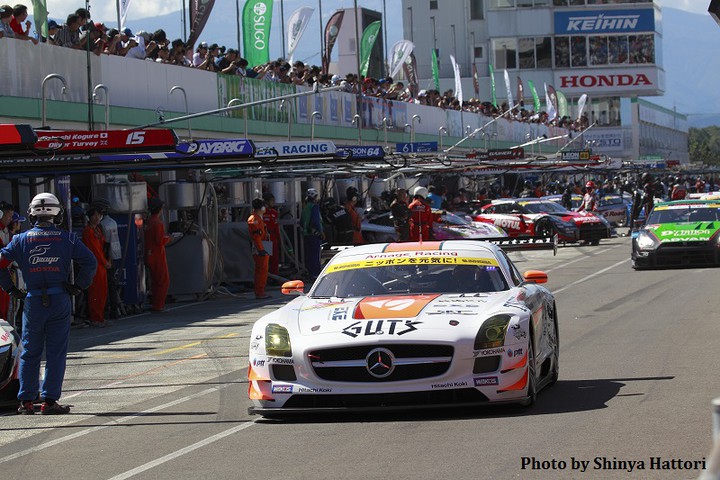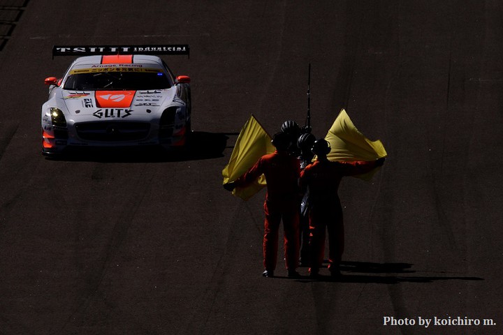 スタートドライバーを託された安岡選手は、300km先のチェッカーを目指して、19番手から追い上げを始めた。しかし、コース幅の狭い菅生サーキットで混戦を制するのは至難の業である。安岡選手はタイヤの温まってくる9Lapあたりから1分22秒後半~23秒台の良いペースをキープしながら、浮上の機会を狙って走行を続けた。真夏を思わせる気温と荒れる路面は、「菅生の魔物」の暗躍を予想させる。クラッシュやアクシデントが続発したが、安岡選手は淡々と走行を続け、6Lap目に18位、23Lap目に16位と、少しずつポジションを上げていった。そして、その直後の24Lap目、バックストレートで500クラスの車両同士が接触して大なクラッシュが発生したためセーフティーカーが導入、29Lap目のピットレーンオープンと共に、コース上にいたほとんどの車両がピットインした。SKT EXE SLSも16位のままピットイン、給油、タイヤ交換を行い、安岡選手からバトンタッチを受けた加納選手はいざ追い上げ、とばかりにピットアウトを試みた。ところがピットレーン出口付近の車両がピットアウトに手間取りピットレーン出口を塞いで動かない。大渋滞の様相を呈するピットレーンには10台以上の車両が身動きもできずに閉じ込められ、コース上を周回しているマシンとの明暗が、ここでくっきりと分かれてしまった。