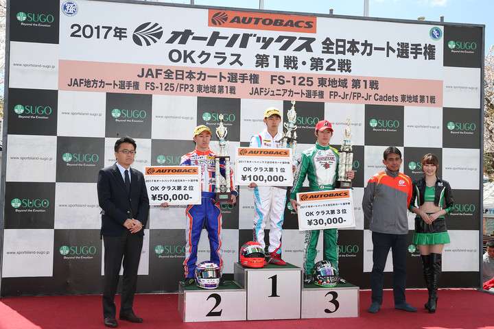 2017年全日本カート選手権OK部門の第1・2戦が4月23日、スポーツランドSUGO西コース(宮城県)にて行われ、佐藤蓮(Drago corse)が優勝した。
