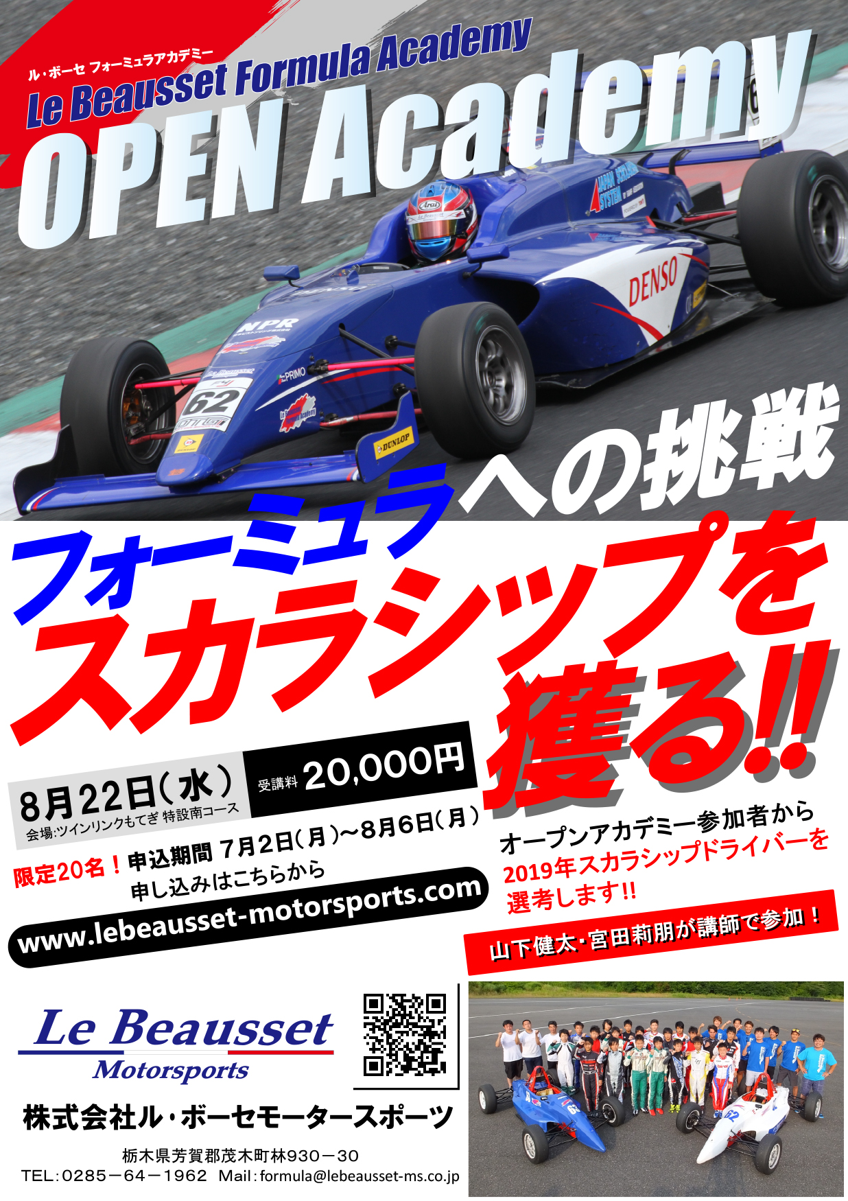 株式会社ル・ボーセモータースポーツ(代表:坪松唯夫)は2日、多くのトップドライバーを輩出してきた「ル・ボーセフォーミュラアカデミーのオープンアカデミーを本年度も8月22日(水)に開催すると発表、同日より募集を開始した。