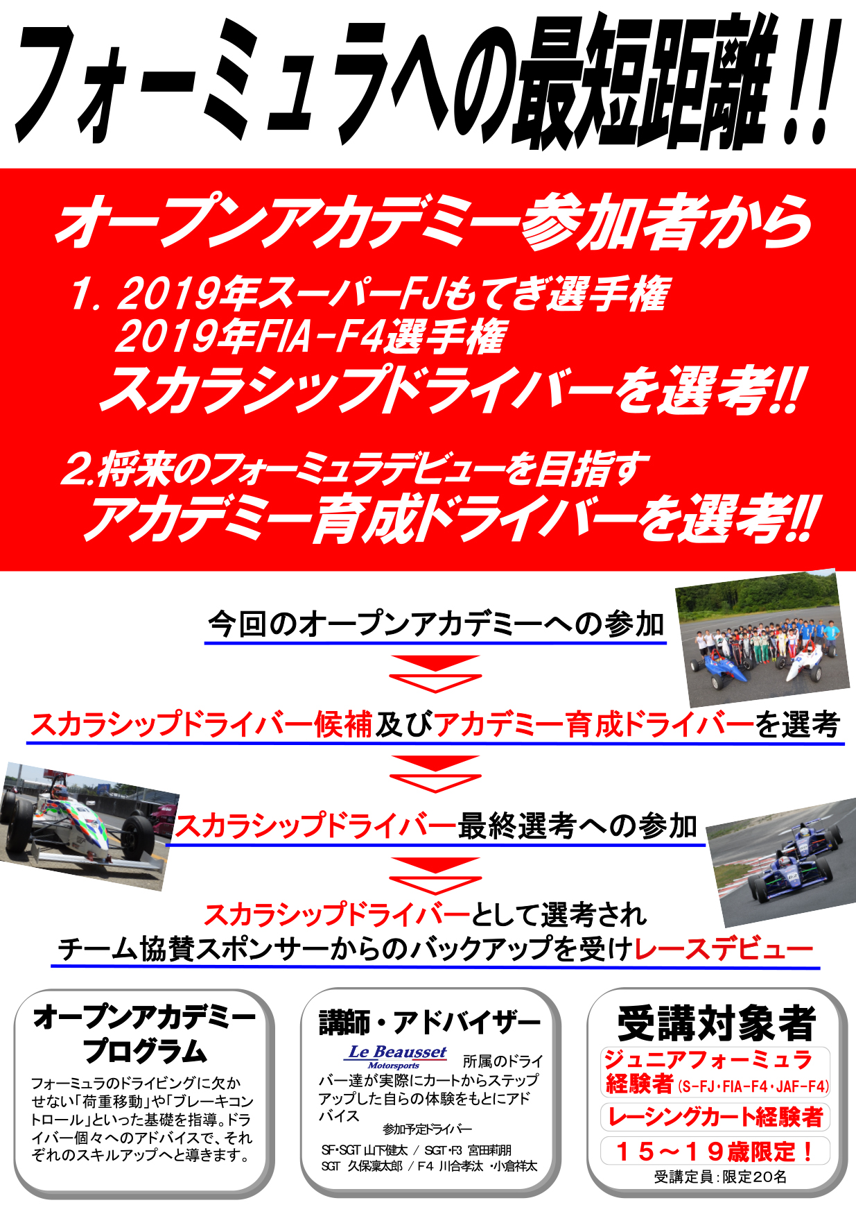 今回は2019年度に同社が参戦するスーパーFJ、FIA-F4のスカラシップドライバーを選考し、また将来的にフォーミュラを目指すアカデミー育成ドライバーの選考もするという。