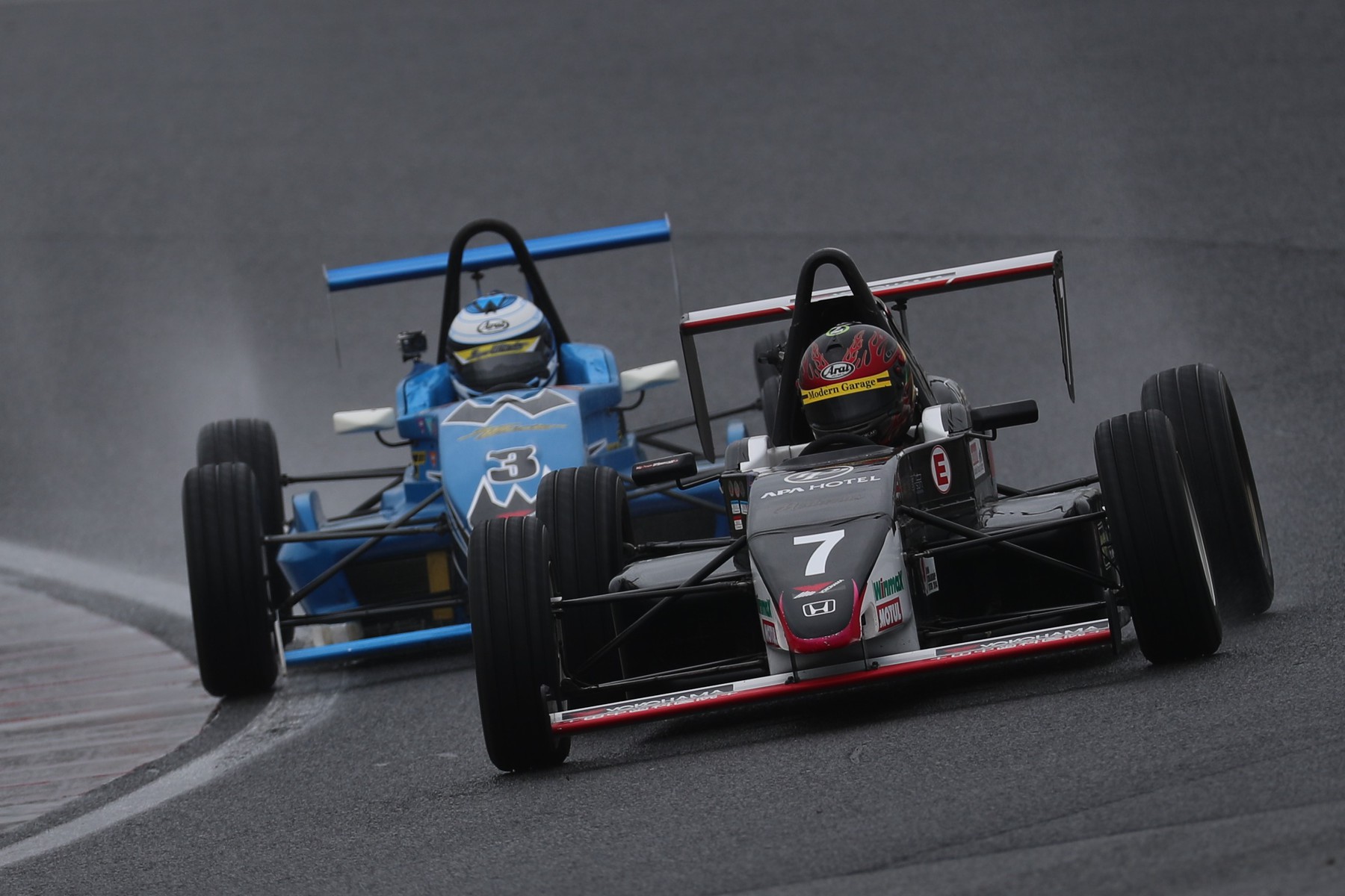 続いて5分時点でルーキー武者が59秒918を出してトップに立ち、昨年11位の10号車・板野貴毅(ZAPムトウ・サービス10V)が2番手に上がり野島は3位へドロップ。武者は59秒517→59秒362とタイムを刻みトップを維持するが2位以下は目まぐるしく順位が入れ替わり、本田、52号車・昨年の日本一決定戦がスーパーFJデビューだった安田航(Fガレージ&SウインズSII)、板野の間で2位争いが展開する。