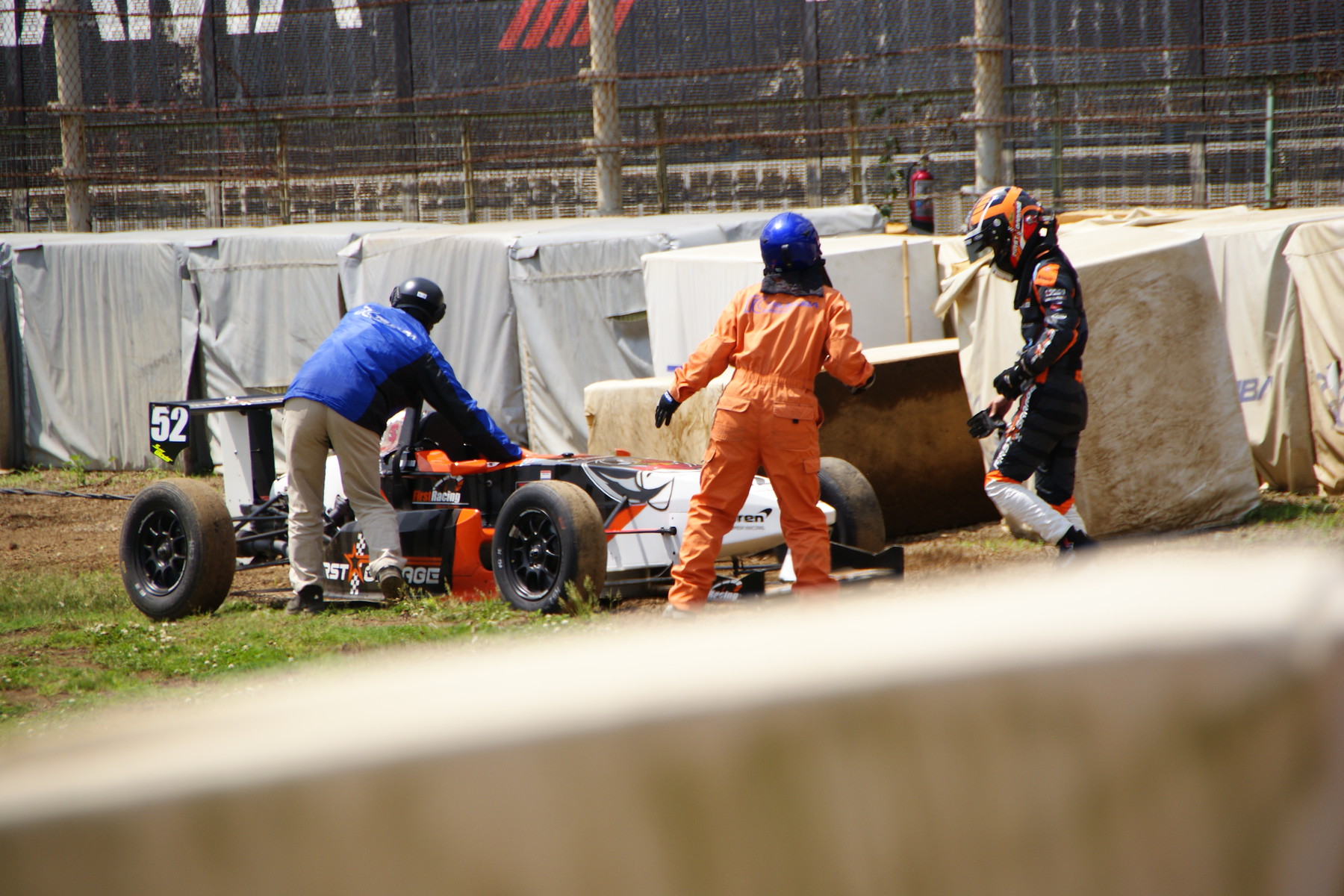 筑波としては3戦めにして今年初めて晴天の下でスーパーFJの決勝レースを迎えた。各チームは、パドックに並べられたマシンのコックピットに乗り込んだドライバーにパラソルを差しかけて日陰を作った下で最後の確認に余念がない。