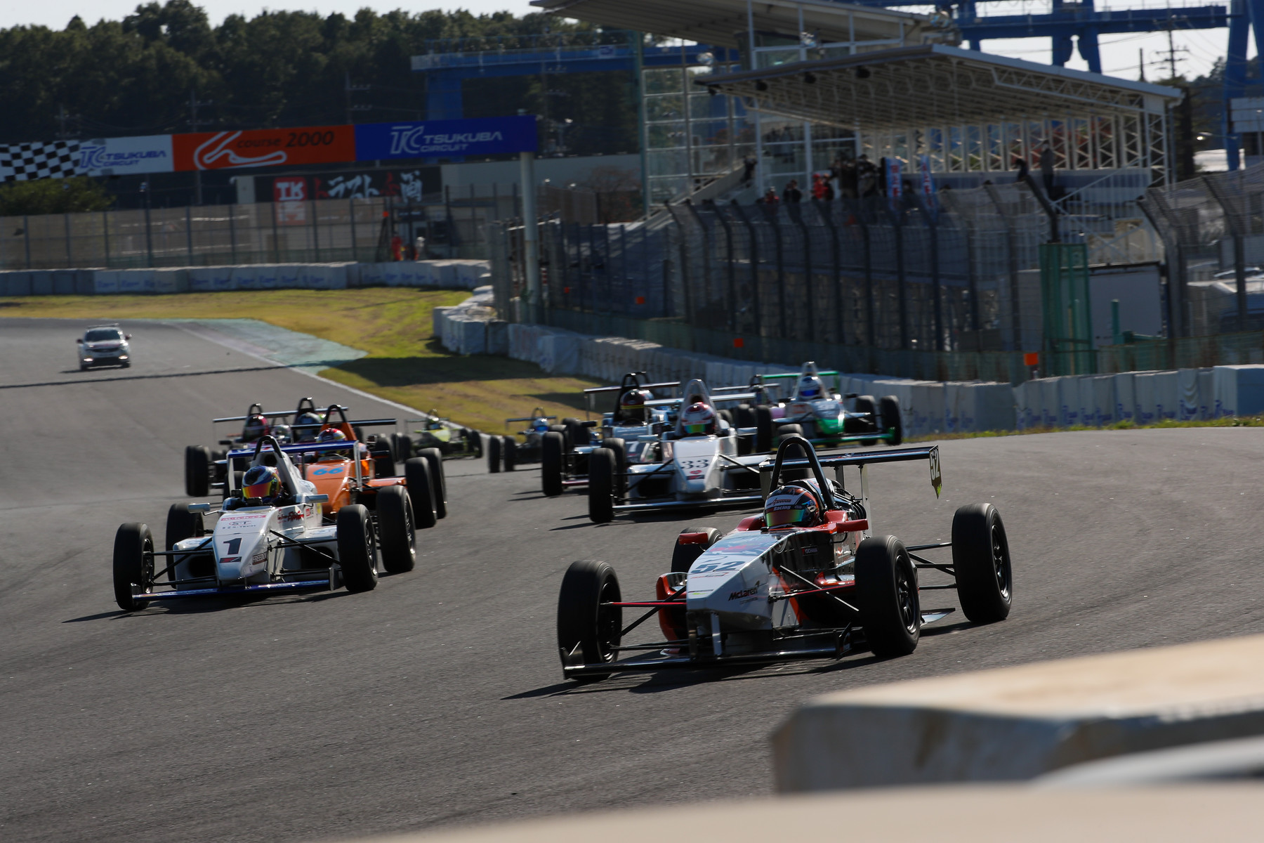 午前中の予選から温度がじわじわ上昇した筑波サーキットはスーパーFJの決勝開始時点で気温19度と絶好のドライコンディション。予選タイムが拮抗していた事から緊迫したスタートが予想された。