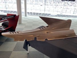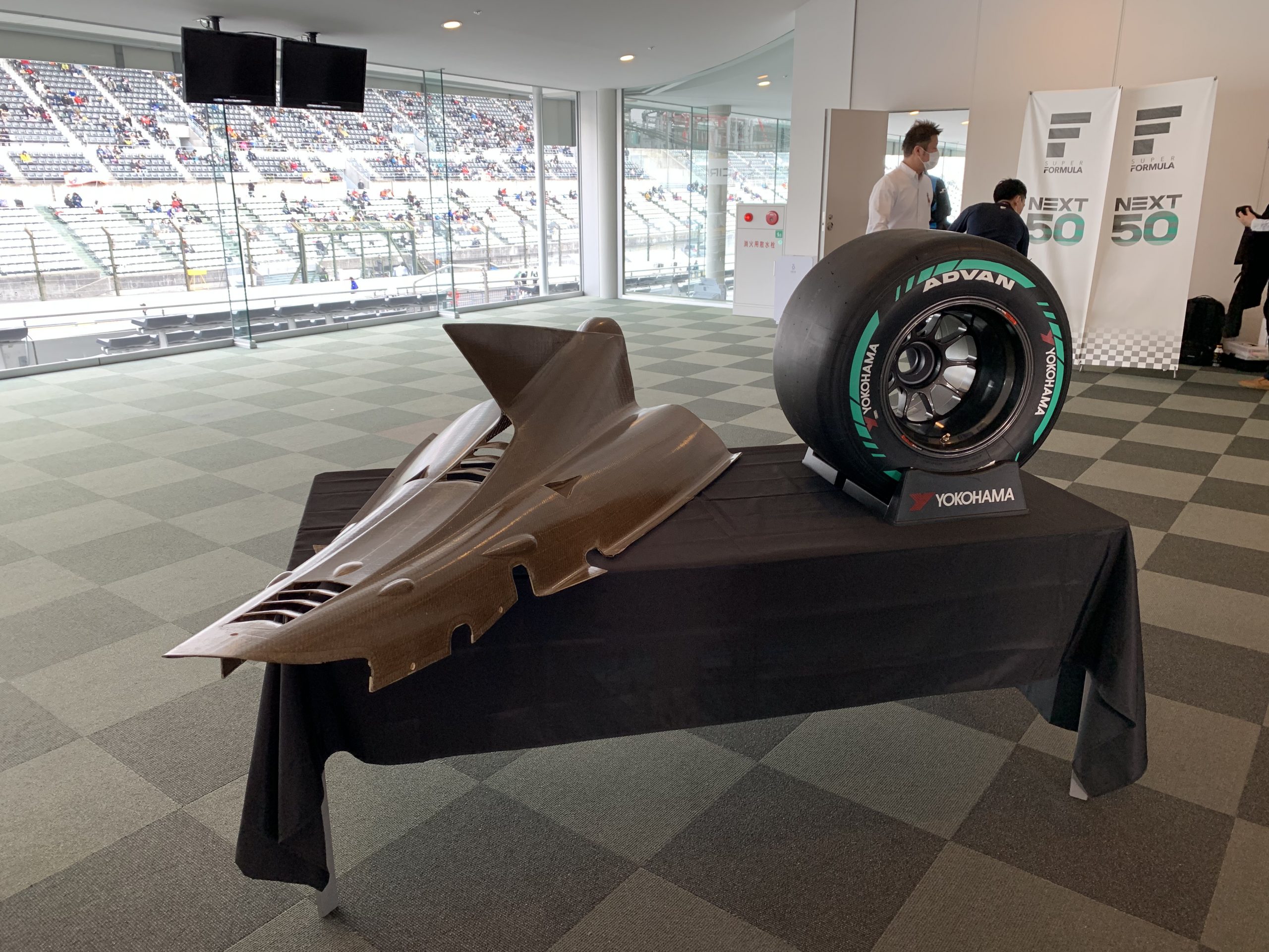 素材については、現在多くの部分で使用されている炭素繊維(カーボンファイバー)を、麻などの天然素材を活用したバイオコンポジット材に置き換えていく。会場には実際にバイオコンポジット材によって製造されたエンジンカバーが展示されていた。これらの使用により、同等の剛性と重量を確保しながらCO2を75%削減しうるという。今回素材開発を担当するBcomp社はスイスに拠点を置くベンチャー企業で、彼らの技術はマクラーレンF1チームのレーシングシートにも採用されている。スーパーフォーミュラでは今後段階的に使用範囲を拡大していく。