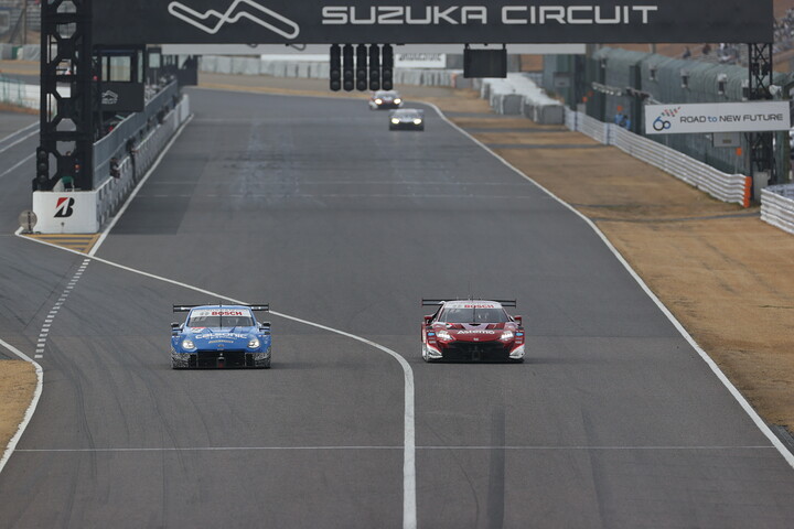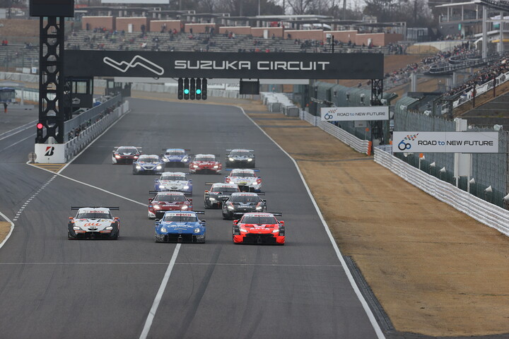 ポールポジションからスタートしたのは昨年王者のNo.36au TOM'S GR Supra(坪井翔)。2番手にはNo.8ARTA NSX-GT(野尻智紀)がつけ、今年からニッサンZで参戦するNo.12カルソニック IMPUL Z(平峰一貴)が3番手だ。