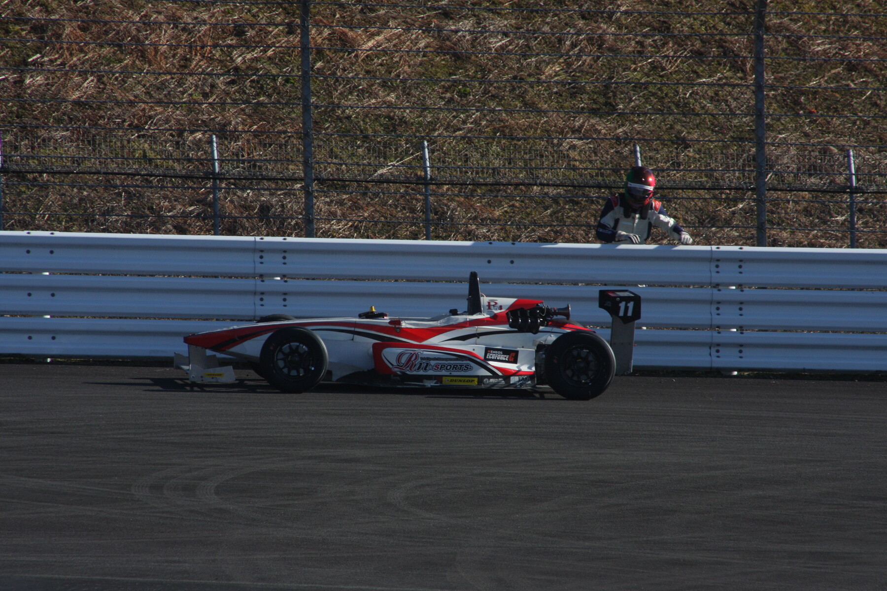 残り4分、内田が2分7秒021とタイムを削ったが、直後に村田が6秒592と2分6秒台に入れてトップへ。内田2番手。齊藤慈岳(FER WILD LIFE KK-S2)が7秒276で3番手、4番手池田に続く5番手に突如上がってきたのが熱田。今年7月もてぎの第4戦でレースデビューしたものの決勝はスタート直後の接触に巻き込まれてコースアウト、リタイヤに終わって以来の参戦になる熱田はここまで最下位のタイムで、直前の周回では第5コーナーでスピンを喫していたが、直後の周回で7秒443を出し、チームメイトで新人仲間の渡辺を6番手に押しやって上がってきた。