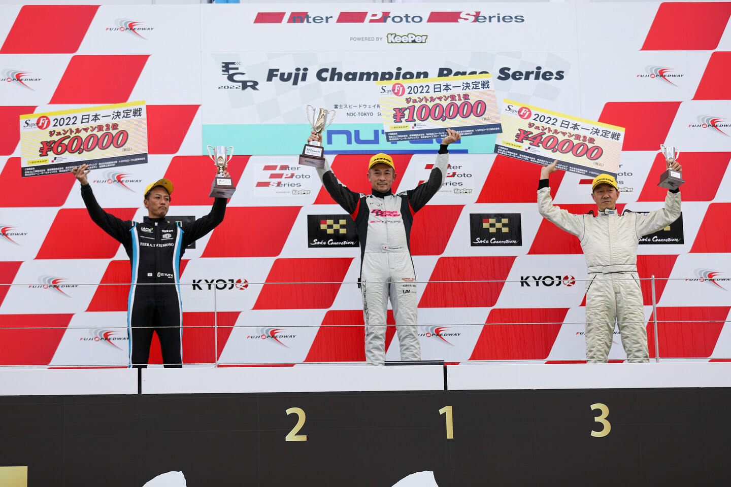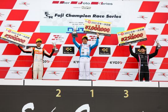 2022年スーパーFJ日本一決定戦決勝は富士スピードウェイにて12月11日(日)12周で開催され、3番グリッドからスタートの清水啓伸(Drago CORSE)が、岡本大地(FTK・レヴレーシングガレージ)、森山冬星(DIXCEL/ROYAL/MYST)との三つ巴のバトルを勝ち抜き優勝。見守る道上龍代表と共に優勝を分かち合った。