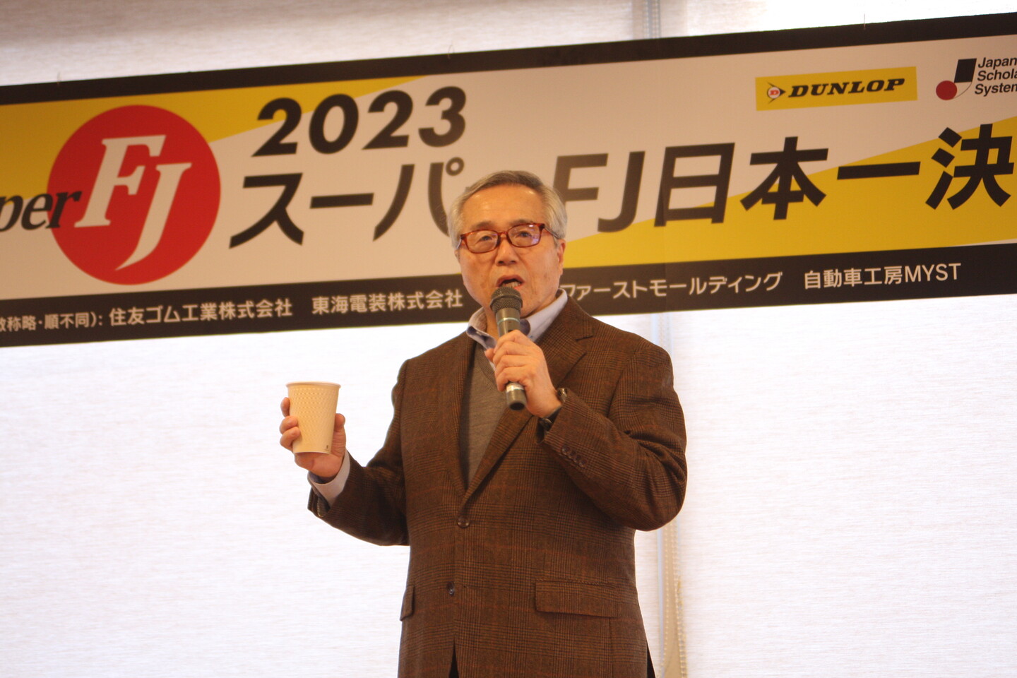 高秀組織委員長とジャパンスカラシップシステム(JSS)畑川代表が挨拶。畑川会長の挨拶の中で、全国各サーキットを回って行われる「スーパーFJジャパンリーグ」に関して、今年の6大会(モビリティリゾートもてぎ、オートポリス、筑波サーキット、スポーツランドSUGO、岡山国際サーキット、富士スピードウェイ)に加えて鈴鹿サーキットが追加され7大会になる旨発表があった。