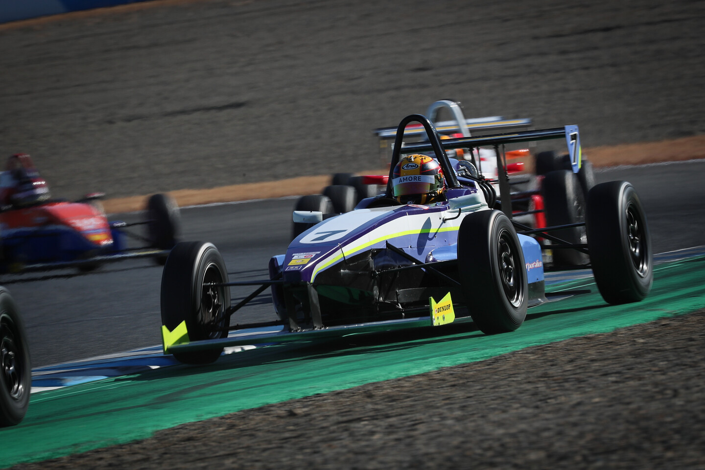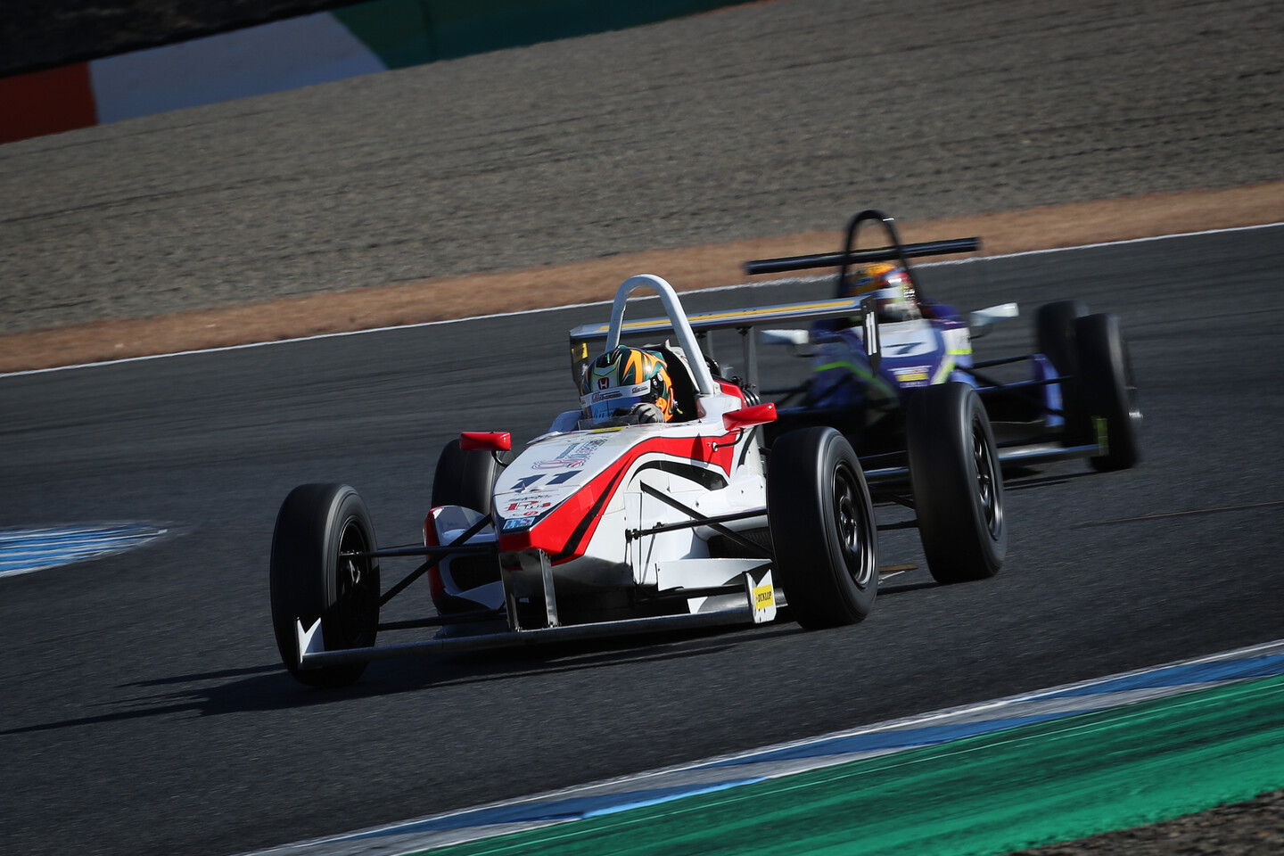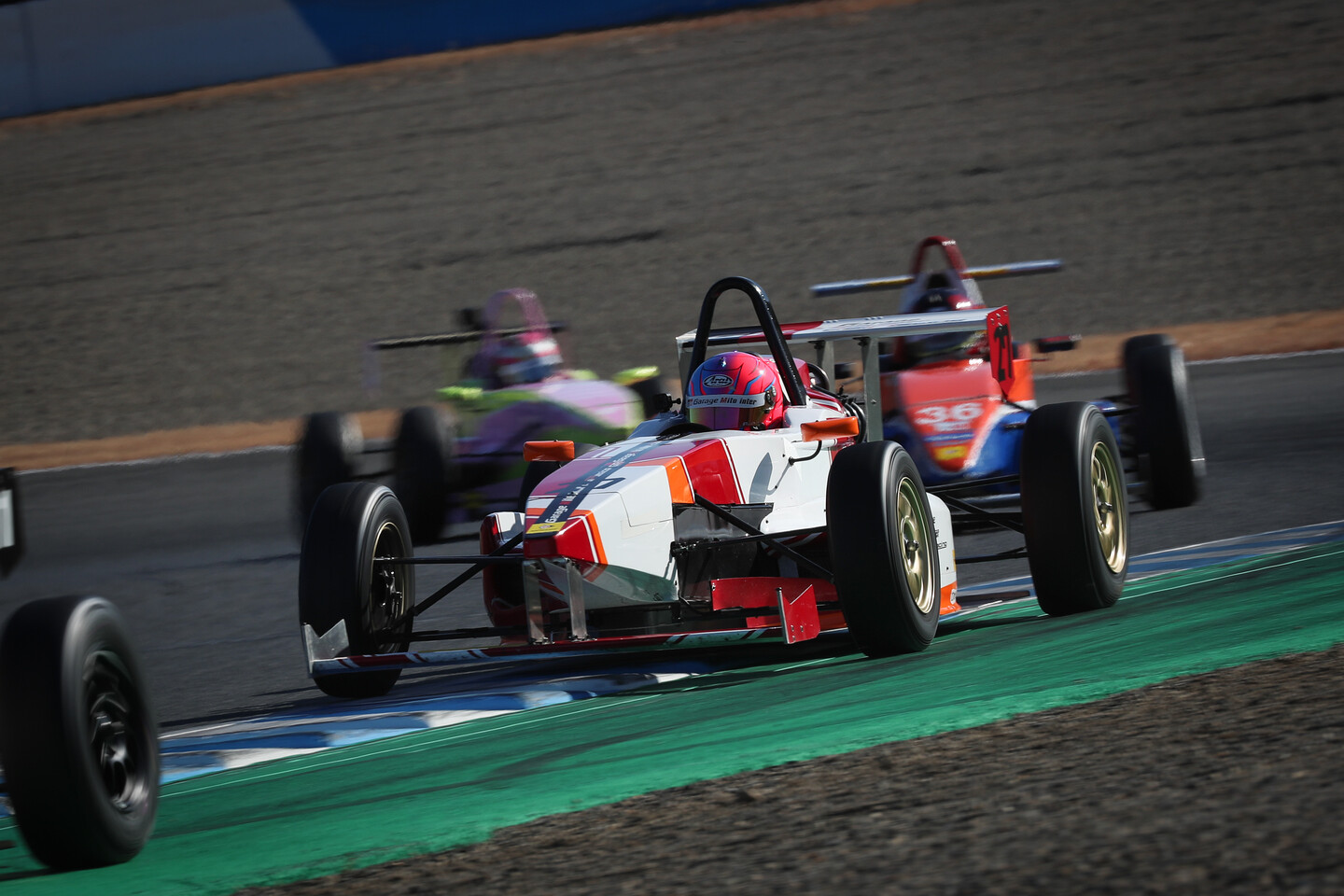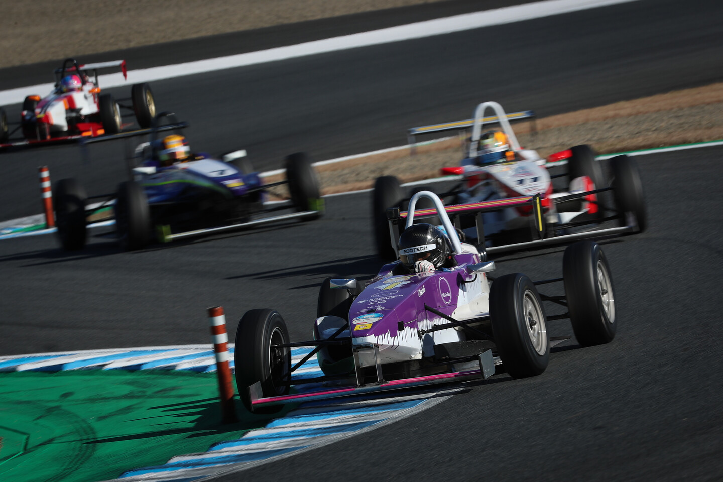 フォーメーションラップからスタート、ポールシッターの迫の反応がにぶく、2番グリッドから発進の白崎が前に出るとホールショットを奪い、トップで第1コーナーへ。後方では6番手スタートの元山泰成(Ecotech Racing F)の勢いがよく、前からスタートの豊島里空斗(C.S.I Racing ED)と村田悠磨(Rn-sports制動屋Vieureka)を第3コーナーまでに片づけて4位へポジションを上げる。豊島5位の後方には7番グリッドからスタートの渡会太一(FTKレヴレーシングガレージ)が進出している。元山は3番手スタートの座を守っていた椎橋祐介(FG&SW NMSP 919 KKSII)も第5コーナー進入で仕留めて3位へ、さらに渡会もアウトから豊島に襲いかかり130Rまでに前に出て5位、渡会は今年は各地のスーパーFJにスポット参戦していてSUGOやオートポリスで優勝も飾っている。今回は練習走行から予選までやや苦労していたが、ここにきて持ち前のスピードを取り戻したか。さらに豊島はS字で村田のオーバーテイクも許してしまい7位までドロップ。