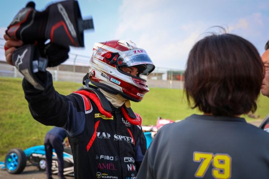 「チーム初の優勝です。2018年の2月からまるまる5年と半年かけて、ちょっと長い道のりでしたけど、なんとか、夢だったスーパーFJ筑波での優勝、達成できてほんとに、まだちょっと現実感がないというか、それぐらい嬉しいです。(今日の角間選手のレースぶりは?)スタート、一瞬失速があったのですけど、うまく小村君がイン側をブロックしてくれて、そのまま隙間をすっと行ってくれて、第1ヘアピン抜けた所を見ていたのですよ。これは行けたな、と。後はなんとか頑張れ、抑えこめ、と思っていたら、抑えこむどころかベストタイム連発でどんどん差をつけていたので、彼はほんとに凄いドライバーです。びっくりしました。レース前、グリッドで一言だけ「思い切りはしゃいで来い、イケイケで行け」とその言葉しか出てこなかったんです。彼はグランツーリスモから来ている人間なので、リアルをバーチャルな走りでどれくらい行けるか、という部分で見ていたのですけれど、彼のグランツーリスモでの走りが実車でレースできたら最強だと僕は思っていたので、その言葉を選びました」