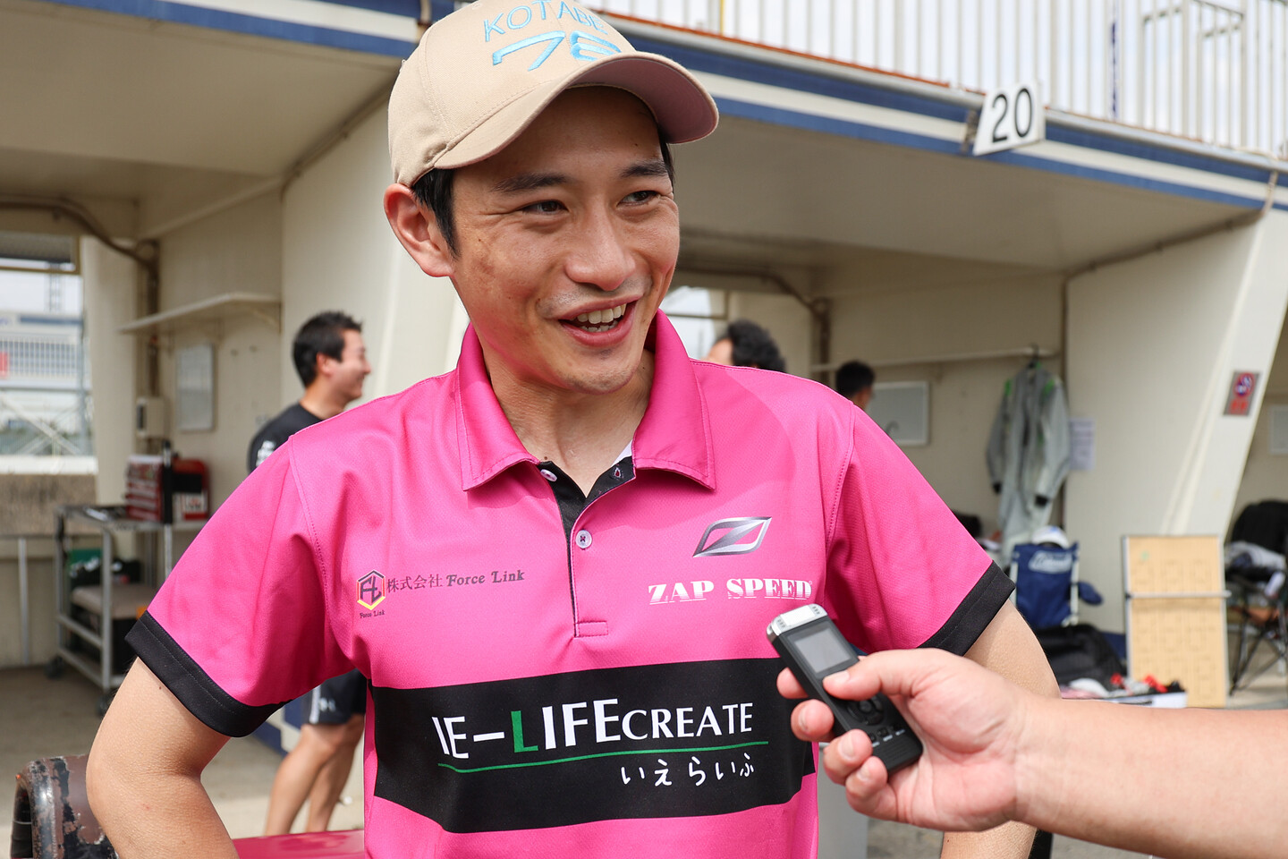 「ピットレーンでスピンしちゃいました。(原因は?)シフトミスというか、自分のミスですね。ピットインしたのはタイヤのエアー(圧)が上がっていたので、それを下げる為にです。ピットレーンでのスピンでペナルティになるとは言われているので、どんな裁定になるかわかりませんけれど、気持を切り替えて。ミッションやって、レース出られるかまだわからないですけれど。(それまでのマシンの感触は)いい感じでした。前後バランスもよくてセットもよかったです」