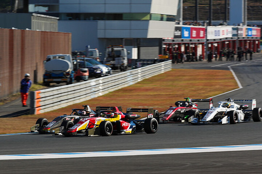 好スタートを切ったのは2番グリッドの菅波冬悟(B-MAX ENGINEERING 320)でインからポールポジションの木村偉織(HFDP WITH B-MAX RACING)に並びかける。この2台は1コーナーで並走するが、チャンピオン獲得のため接触してリタイアだけは避けたい木村が引き、菅波がトップに立った。