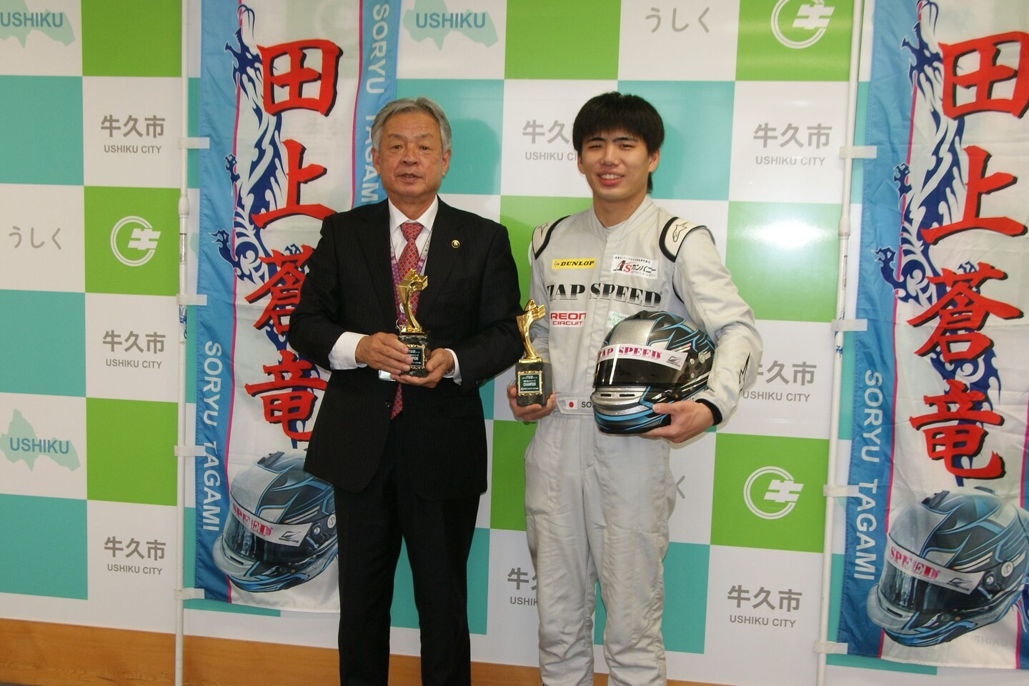 2022年スーパーFJもてぎ/菅生シリーズと筑波/富士シリーズの両タイトルを獲得した田上蒼竜選手が、1月24日に地元である茨城県牛久市役所を訪問。根本洋治市長に面会し、レース活動について報告した。