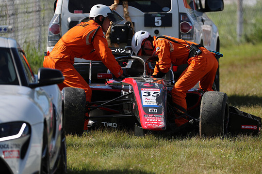 第4戦決勝は午後3時30分にフォーメーション開始。規定周回数は21だ。ポールポジションの小林利徠斗(モビリティ中京 TOM'S 320 TGR-DC)は、動き出しのクラッチミートに失敗して出遅れたものの、なんとか隊列に追いついて、本来のグリッドに戻ってきた。