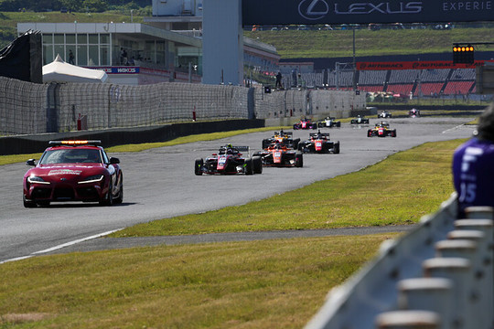 スタートでは小林が1コーナーを制し、野中が2番手で続くが、その後方では荒川麟(TEAM DRAGON 324)と古谷悠河(Deloitte. HTP TOM'S 320)が3位争いを展開。古谷が3コーナーでコースオフを喫して順位を落とす。さらにその後方で荒尾創大(HFDP WITH TODA RACING)と中村仁(モビリティ中京 TOM'S 320 TGR-DC)もコースオフ。このうち中村がウォールに突っ込んでストップしたため、2周目から早くもセーフティーカーが導入されることになった。
