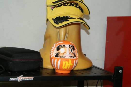 53号車「ファーストガレージ制動屋S2」の石井大雅は今回のメンバーで唯一のSIMレース出身。筑波/富士シリーズにフル参戦し最終戦までチャンピオンの目を残していたが2位。もてぎ戦と鈴鹿戦にもスポット参戦した。今回は月曜日の練習走行でコースアウトしたとかで、気合を入れなおすためにと高校球児のような坊主頭にしてきた。石井といえばいつもレースに持参するダルマが有名で、優勝したら両目を開けると誓っている。