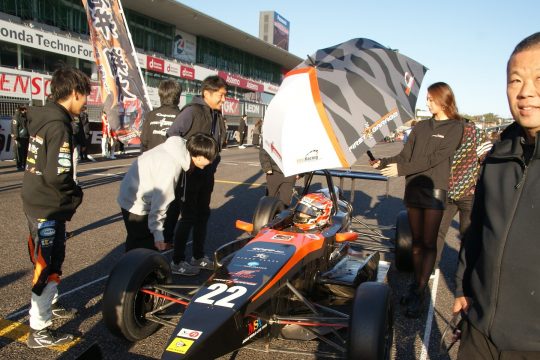 コースイン直前、各ドライバーは意外とリラックスした表情でそれぞれマシンに乗り込んだ。ここまで来たらあとは頼れるのは自分のみ、という心境か。津田を除く4名はユーズドタイヤを選択。10周のスプリントでウオームアップの早さを選んだか。一方津田はニュータイヤを装着。12月とはいえ気温は13度まで上昇、日差しもあり路面は暖まりつつあり、すぐに性能を発揮できると踏んだようだ。グリッドへの試走で予選3番手と7番手のマシンが接触、クラッシュ。レース開始前に上位のグリッドが二つ空席ということになった。