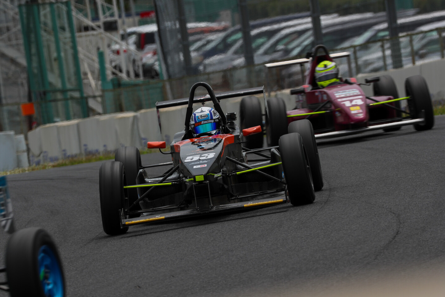 トップグループから脱落した酒井には5位塚本が接近、2周目0.320秒、3周目0.289秒と間合いを詰めてプレッシャーをかける。しかしここで塚本は焦ったかヘアピンで単独スピン、すぐにレースに戻るが14位まで大きくポジションを落としてしまう。