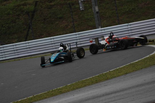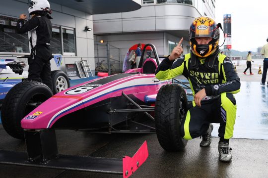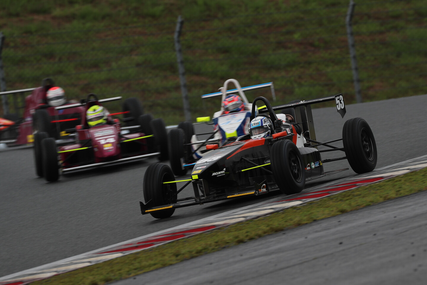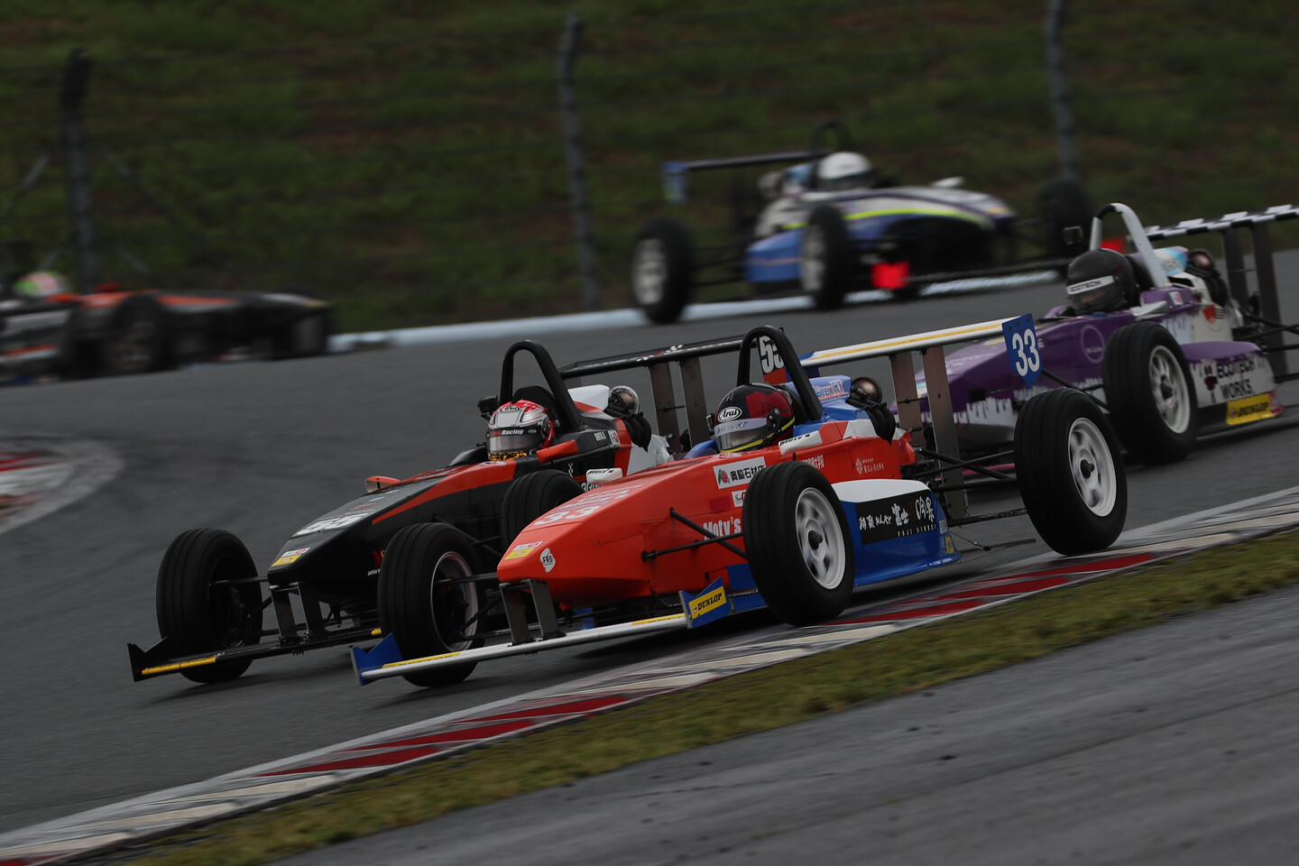 このアクシデントでセーフティカー(SC)投入が宣言される。この時点での順位は石井~伊藤~黒川~小田~酒井~磐上隼人(アルビ富士吟景GIAED)というトップ6。小田は4位まで進出、渡会は前を行くこれも鈴鹿組の元山泰成(Ecotech Works Racing F)にやや手こずり8位。さらに渡会の後方にチームメイトの松井が上がってきている。そして周囲が驚いたのが、10位につける落合蓮音(ファーストガレージKKS-2)で、今回がスーパーFJで2レース目、20番グリッドからスタートし中団の混戦をかいくぐってオープニングラップで14位、2周目13位、3周目10位までポジションを上げてきた。