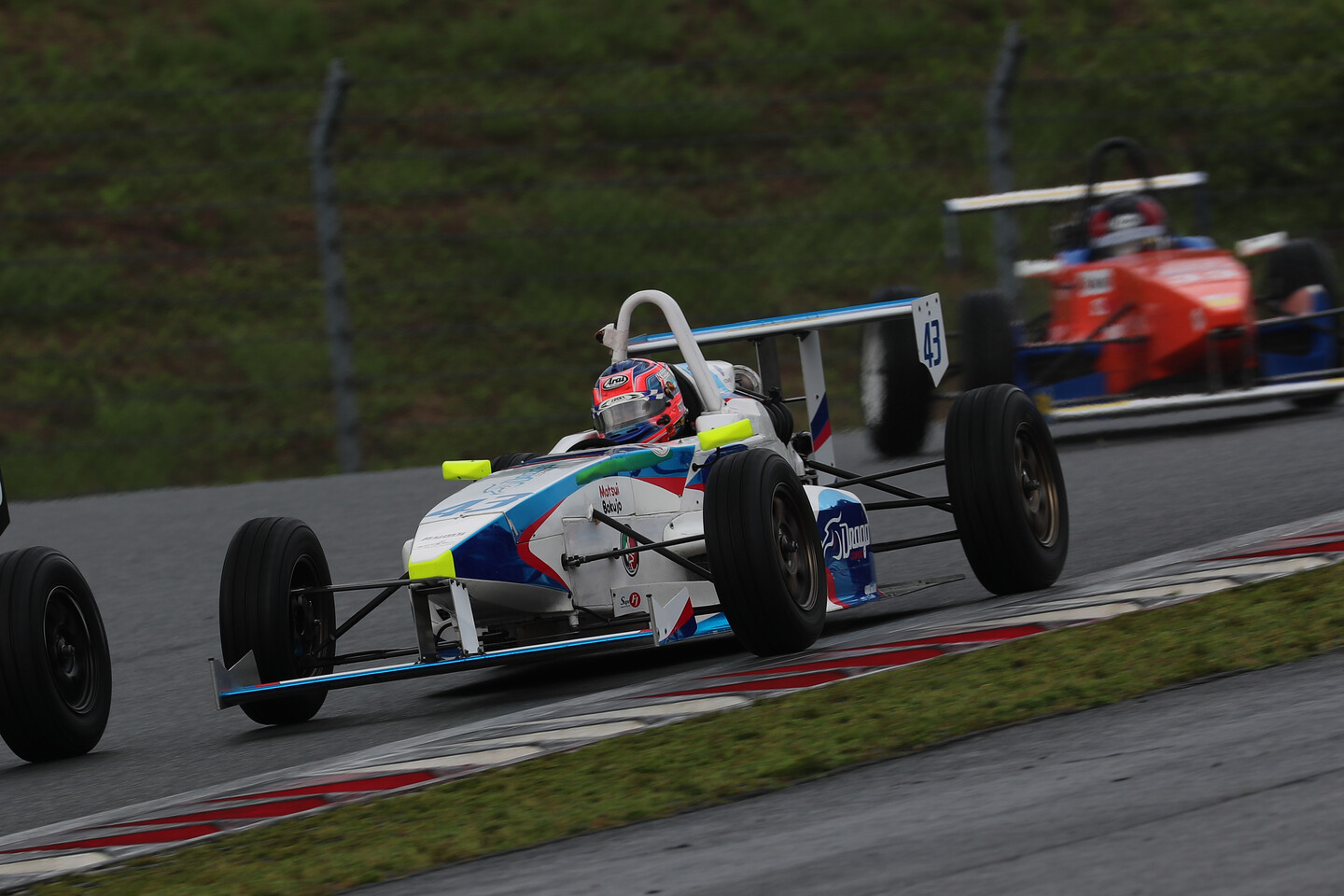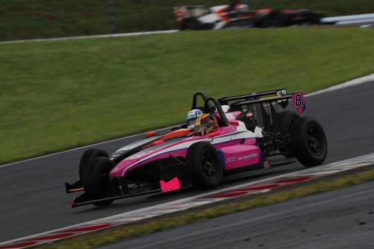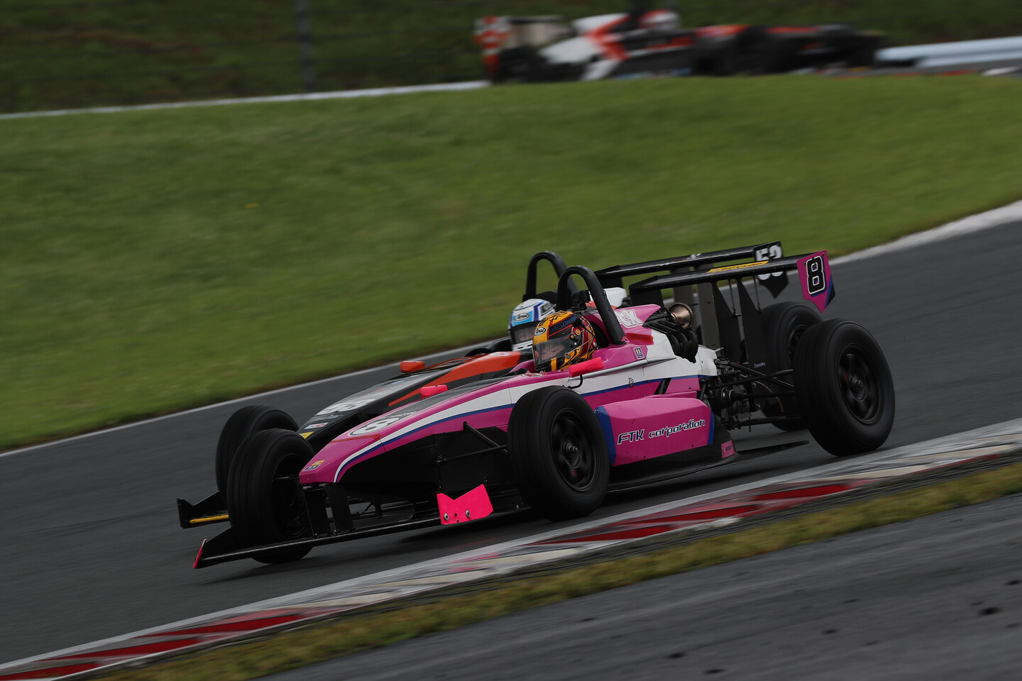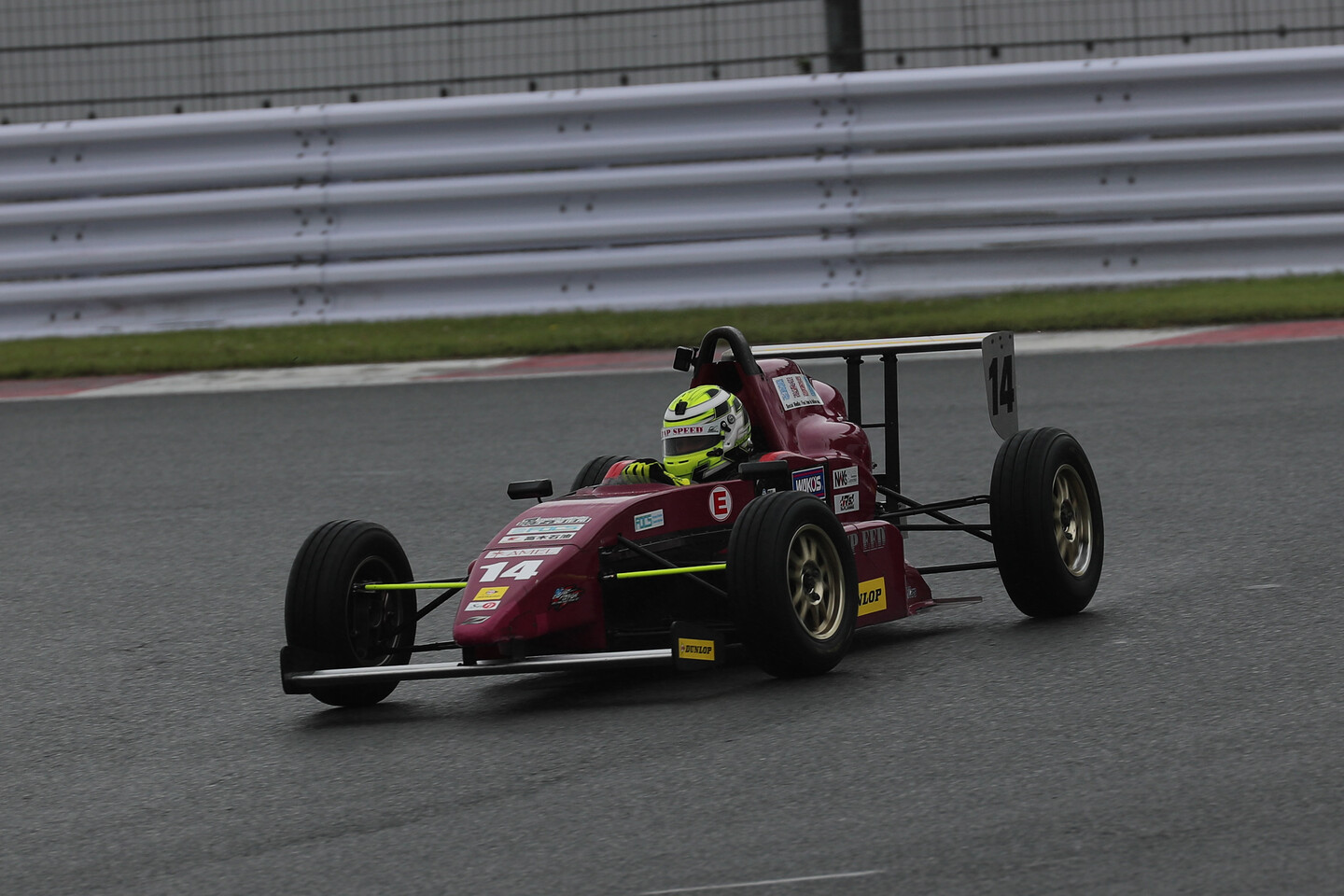 このアクシデントでセーフティカー(SC)投入が宣言される。この時点での順位は石井~伊藤~黒川~小田~酒井~磐上隼人(アルビ富士吟景GIAED)というトップ6。小田は4位まで進出、渡会は前を行くこれも鈴鹿組の元山泰成(Ecotech Works Racing F)にやや手こずり8位。さらに渡会の後方にチームメイトの松井が上がってきている。そして周囲が驚いたのが、10位につける落合蓮音(ファーストガレージKKS-2)で、今回がスーパーFJで2レース目、20番グリッドからスタートし中団の混戦をかいくぐってオープニングラップで14位、2周目13位、3周目10位までポジションを上げてきた。