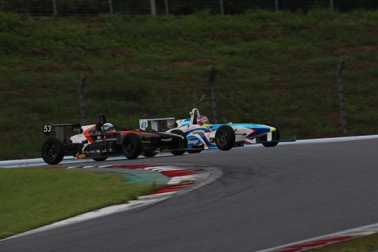 スリップストリームが大変利く富士ではコントロールライン上で0.5秒程度の差があっても、TGRコーナー進入時にはほとんど差がない状態になる。それを利用したのが角間で3周目のストレートエンドで酒井に接近、テール・ツー・ノーズ状態でTGRコーナーに進入する。しかし角間はブレーキングで大きく姿勢を乱し、酒井と接触、アウト側へコースアウト、止まってしまう。リヤセクションのダメージが大きく角間はここで無念のリタイヤ。角間によるとブレーキングポイントが違う酒井に当たりそうになりブレーキの踏力を強めたらタイヤがロックして酒井に接触してしまったとのこと。酒井もこの接触でポジションを落としてしまう。