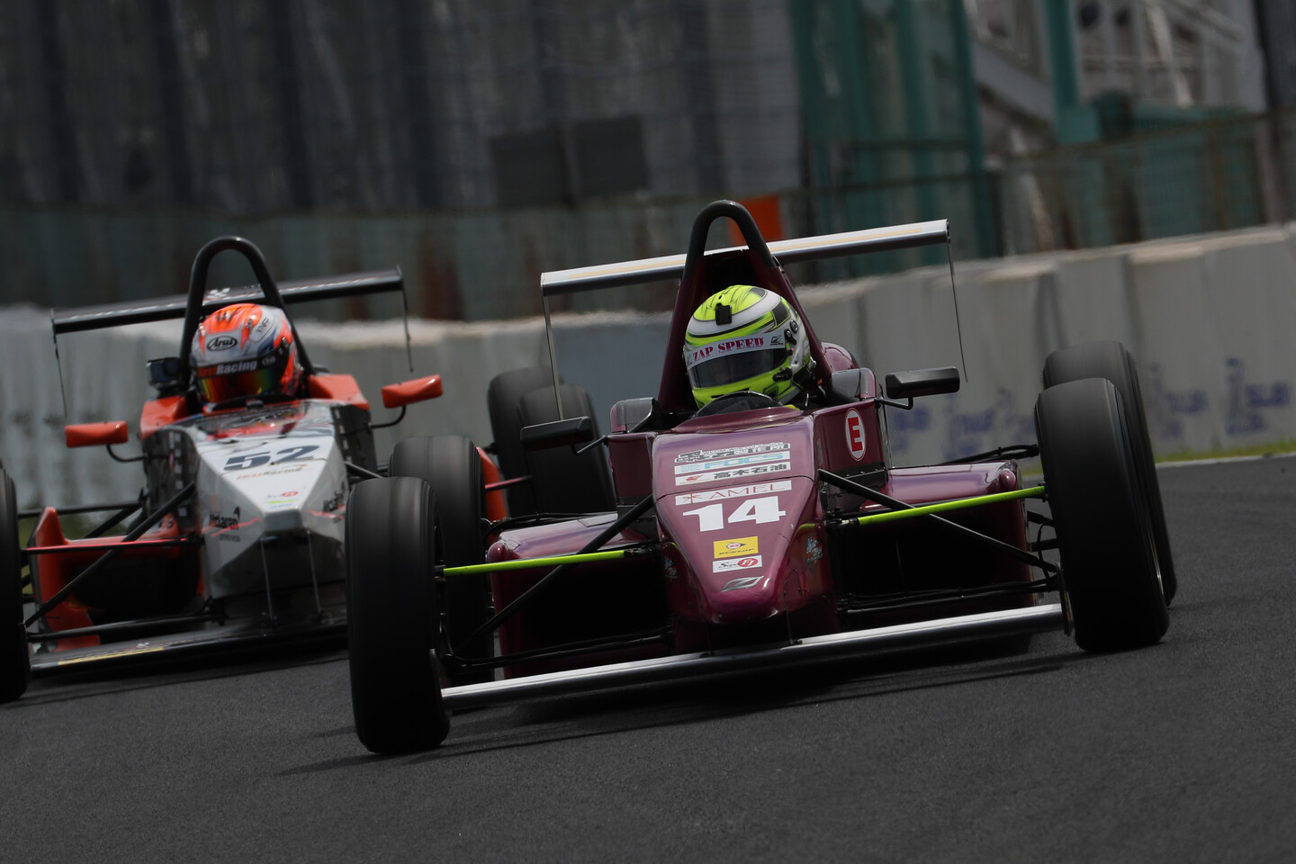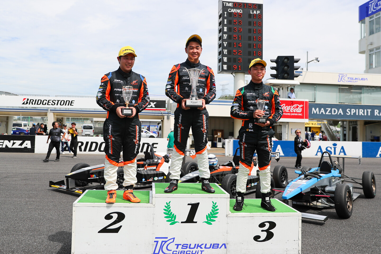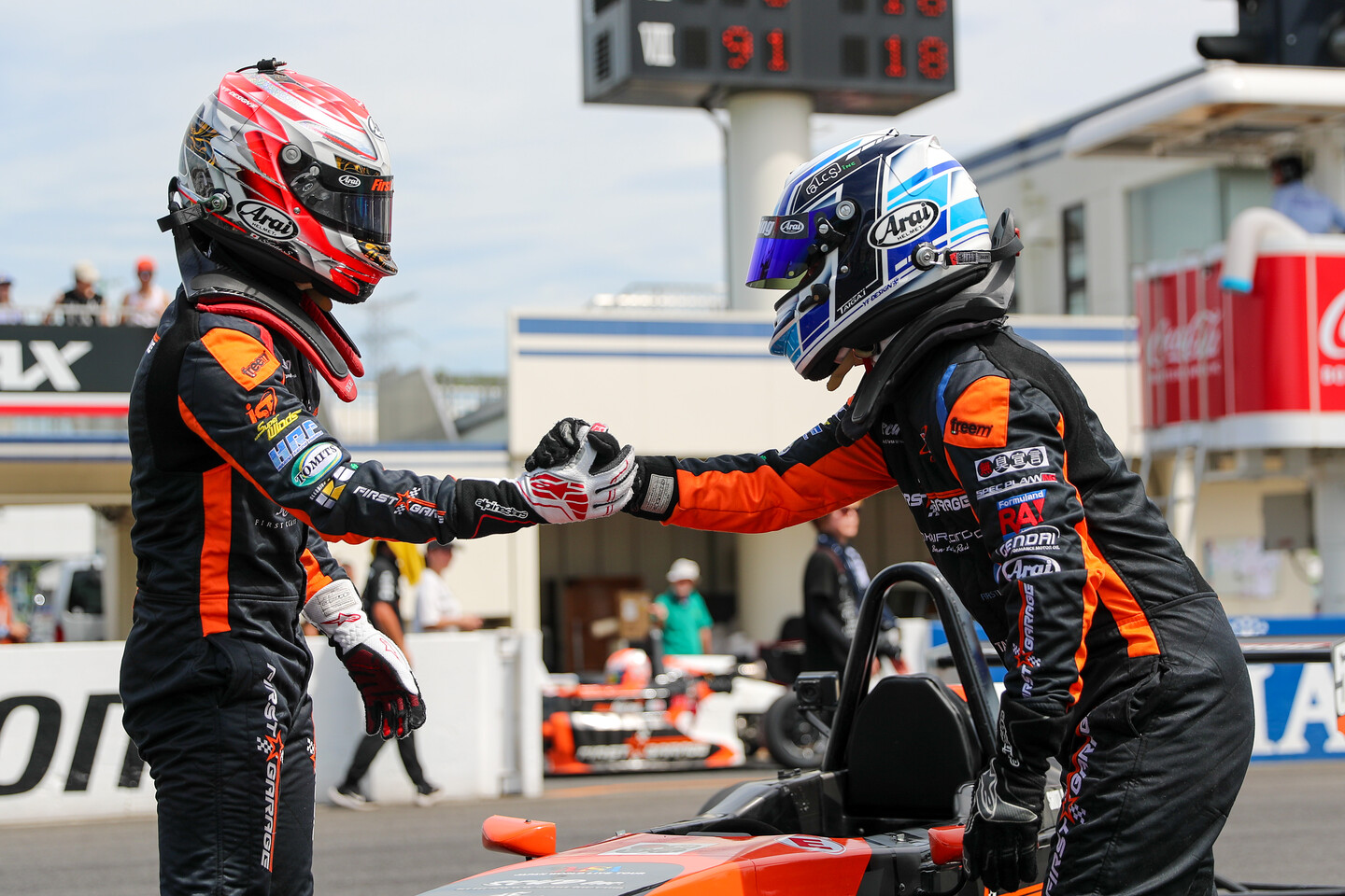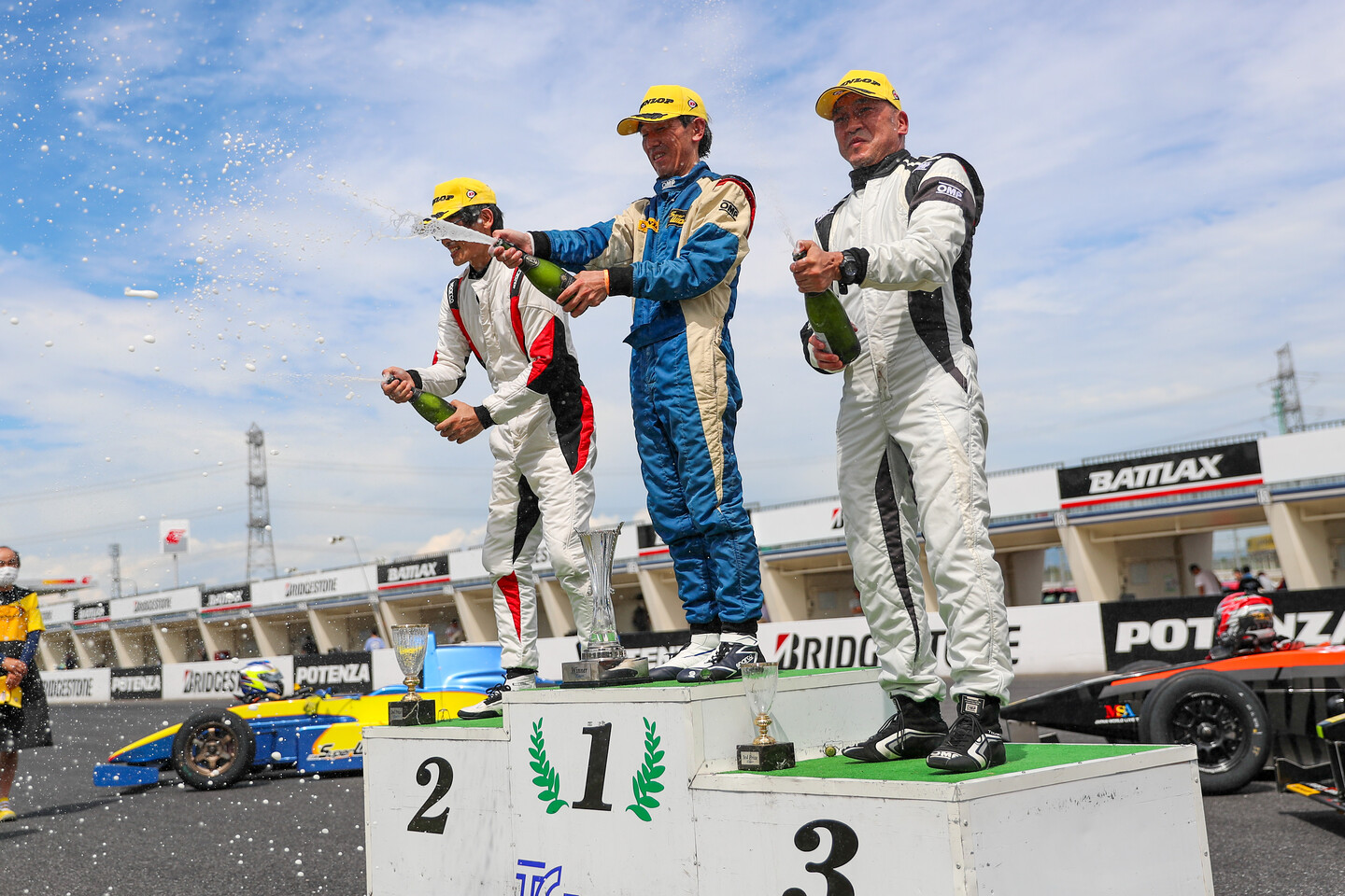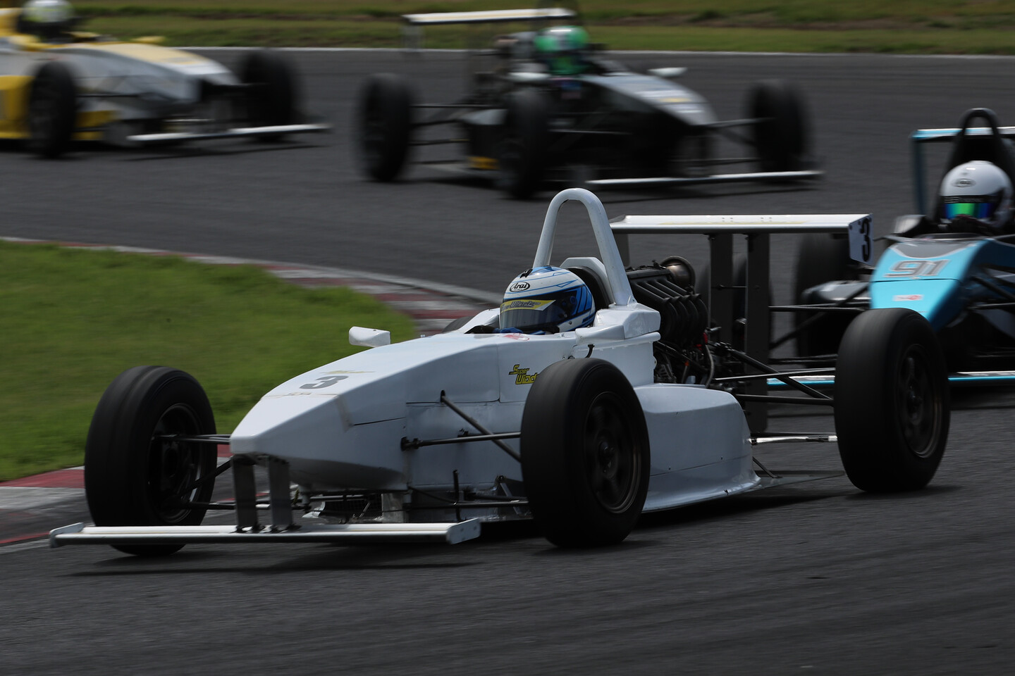 ファイナルラップ、酒井は最後まで石井につけいる隙を与えず0.870秒差でフォニッシュラインを通過、ポール・ツー・ウインの完勝でチェカードフラッグをうけた。2位石井は予選で発生したトラブルからは復活したものの、最後まで勝機を見いだせずに終わった。次戦は「必勝ダルマ」を忘れずに初優勝を目指す。3位塚本はこの2台から大きく後れはしたものの、S-FJでは初の表彰台を獲得。ファーストガレージから急遽拝借したという「霊験あらたかな佐々木孝太選手のレーシングスーツ」のご利益があったようだ。塚本を追い詰めた落合だが表彰台に0.16秒届かずの4位。こちらも最後までもつれた伊藤と津田の5位争いは伊藤が0.254秒差で津田を振り切り5位、津田6位で予選から続く「悪くはないがよくもない」調子から抜け出せなかったようだ。