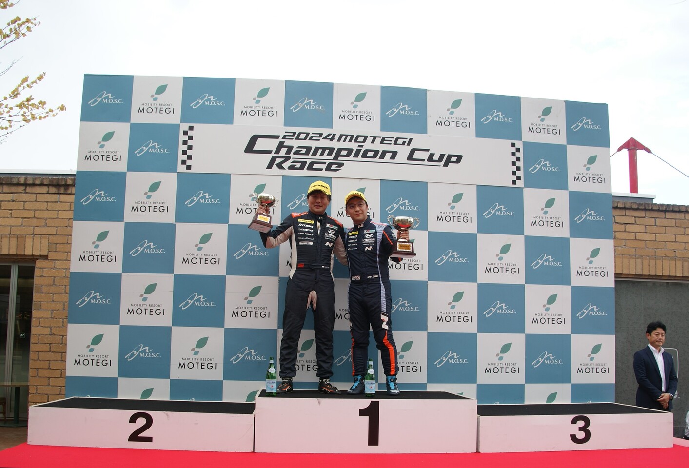 ポディウムに戻ってきた2台の「Hyundai Elantra N TCR」のドライバーは互いに健闘を称えあい、笑顔で肩を組みカメラの前に並んだ。