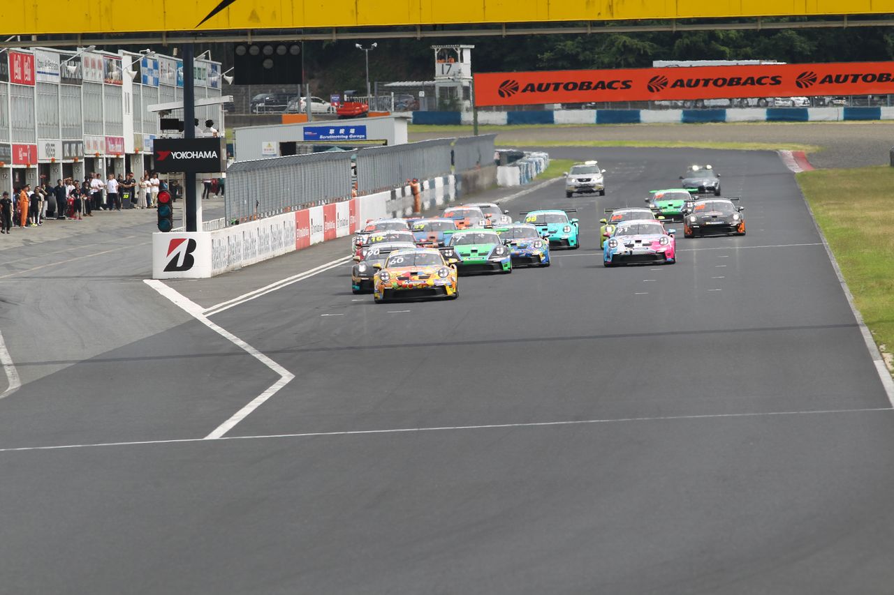 ポールポジションの伊東黎明(SHOWA AUTO with BINGO RACIG)、予選2位の呉良亮(OPERA 90 RACING)は好スタートを切り、予選順位のまま1コーナーへ向かう。一方、同3位の平安山良馬(Porsche Japan Junior Programme)はスタートで出遅れた。同4位の山田遼(HYPER WATER Racing Team)もエンスト気味だったが、平安山の前に出ることに成功し、3位に順位を上げる。