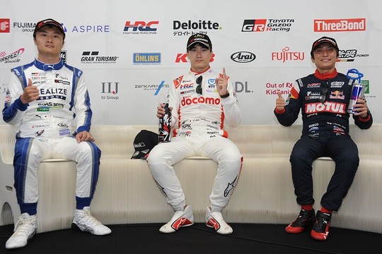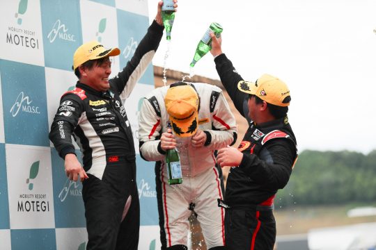 「2人と違ってチャンピオン争いというところに行けていません。波があって、ヘタしたらQ1落ちるみたいな際にいます。今回たまたまポールを取りましたが、次戦の予選でポールを取れるとはまったく思ってないので、小高選手の調子も上がってきてるいるので、2台で上に行って、まずは富士の予選でもう一回前に出られるように臨みたいと思います」