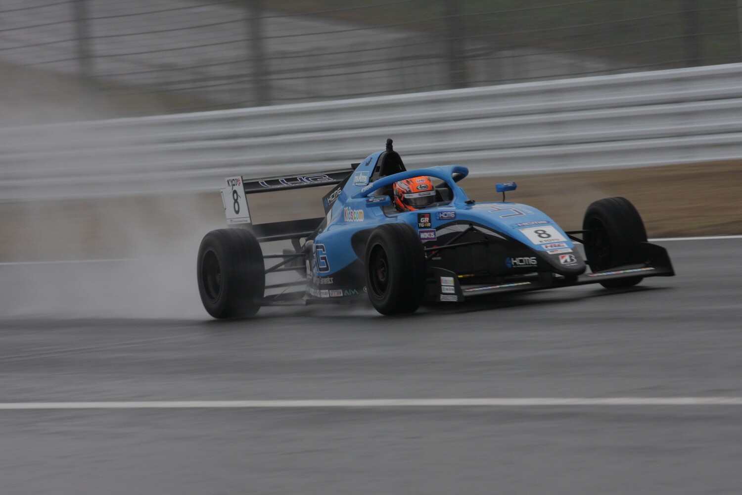 富士スピードウェイは朝から立ち込めていた霧が晴れて視界が開けたものの、雨は小降りになったり強くなったりを繰り返している。SC先導によるスタートが決定され、定刻の午後1時に全車レインタイヤで12周のレースが開始された。気温、路面温度ともに14度で、これだけ気温の低いウエットコンディションはおそらく経験がないだろうという事で、各車SCの後方でタイヤの熱入れに余念がない。6番手スタートのHanaが出遅れたが、最後尾になっていなかったので、SC中に元の位置まで戻ることができる。
