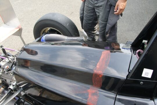 車体各所に塗ったパラフィンの流れた跡を確認すると、ウイングやノーズはきれいに流れていたが、エンジンカウルまわり、特にサイドの部分で空気が流れていないようで、左サイドについている吸気孔には圧がかかっていないようだった。他のコンストラクターではロールバー脇を検討しているという話もあるようで、吸気孔の位置は要検討、もしくは現行型のように統一(エンジンカウル後端に後ろ向きでエアファンネルが露出した形で配置)の必要がありそうだ。
