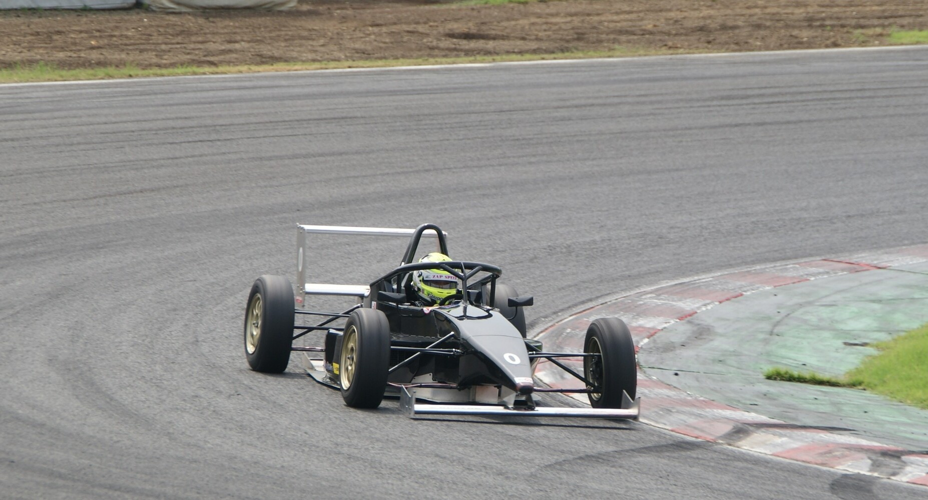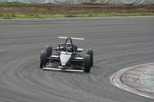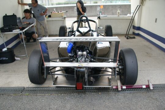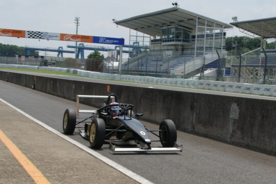 テストは3回あるスポーツ走行枠(1回20分間)の中で行われ、他のフォーミュラマシンとの混走となり、現行型も数台が走っており比較にちょうどいい。まずは1本目が12時30分から開始、ドライバーは荒川。気温33.7度、路面温度55.6度と真夏のコンディションで冷却性能を試すには絶好だとスタッフが苦笑する。タイヤは「かなり古い」ユーズドタイヤで感触を確かめるところから。ラップタイムは1分00秒から始まって59秒1まで詰めて終了。同時に走っていたファーストガレージの車両が59秒台なのでほぼ同等。荒川によるとギヤ比については最もボトムスピードが落ちる第2ヘアピンでやや高めに感じるのと、やはり車体の上の方が重いので動きが大きい感触で、ブレーキングで挙動が不安定になるという。