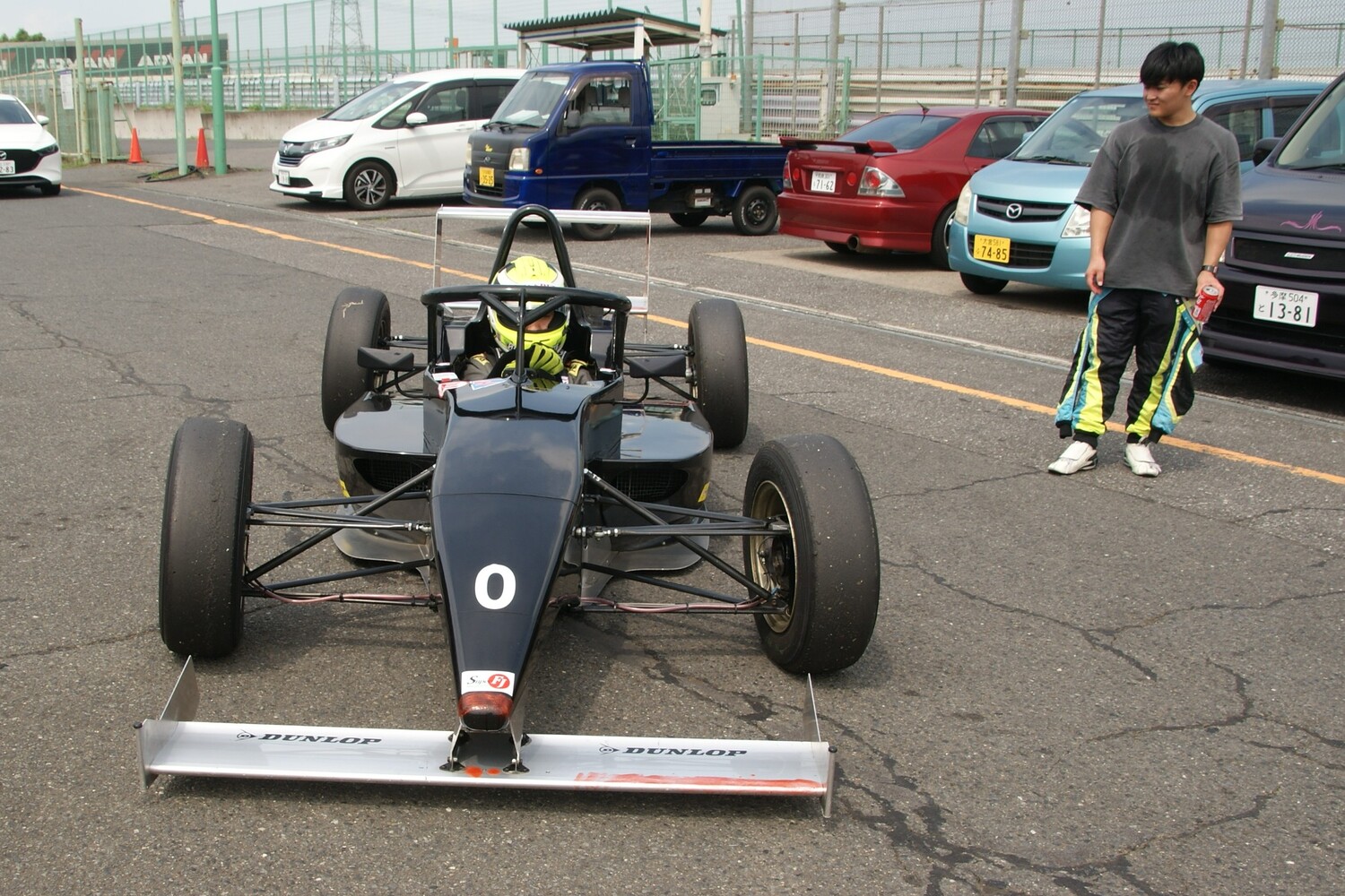 2本目は午後1時50分から伊藤がドライブ。気温33.7度、路面温度49.7度。タイヤは1本目のユーズドのままだ。車体のあちこちに赤いパラフィンが塗られ、空気の流れを後で確認する。 タイムは59秒台から始まりベストタイムは58秒9。直近5月末に行われた筑波のレースの決勝のファステストラップが58秒668で、そのタイムを出したファーストガレージの津田が今日も走っており、同じ走行で58秒6をマークしている。伊藤は何周かした後でスタート練習も実施。前述のとおり3ペダルなのでスタート時はクラッチワークが必要になる。僅かなホイールスピンでスタートしたが、テスト後の会話を聞いていると「かかとを床につけてペダルが踏めないのでスタートしづらかった」ということだった。