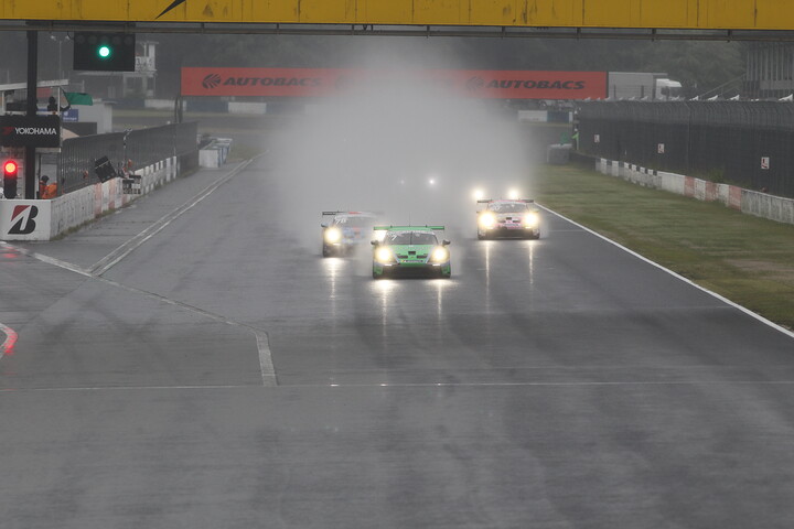 決勝は午後3時35分、セーフティーカー(SC)先導でスタートが切られた。早朝より降り続いた雨は小降りになったが、路面は依然としてヘビーウエットだ。IKEDA(HYPER WATER RACING)が出走を取りやめたため、13台(内プロアマクラス5台、アマクラス3台)が出走した。