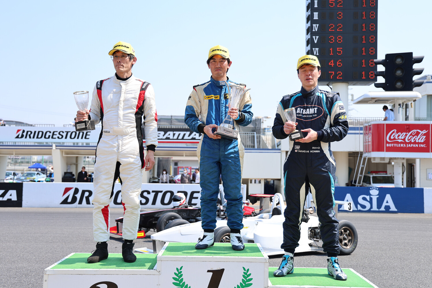 18周を走り切り酒井がトップチェッカー。終わってみれば危なかったのはスタート直後の第1コーナーまでと、パーフェクトウインでフィニッシュした。2位津田でファーストガレージの1-2フィニッシュ。3位マスターズクラスの優勝の秋山は久々のオーバーオールでの表彰台。昨年投入したKK-SIIがいよいよ本領を発揮し始めたか。4位はハタヤマのプレッシャーをしのぎ切った内藤、ハタヤマ、相田というトップ6となった。