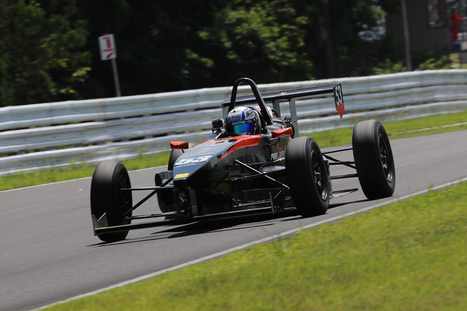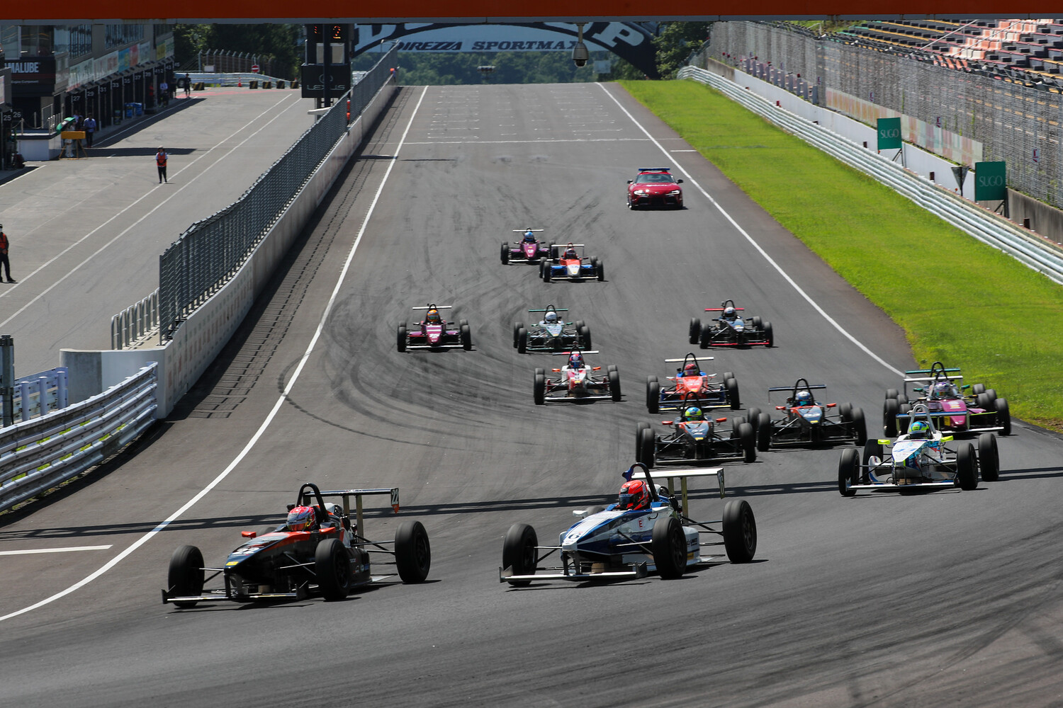 午前中の予選に続いて行われる第3戦決勝は午後1時40分にフォーメーションラップ開始。土用の丑の日らしく気温はうなぎ上りで32度。路面温度58度という真夏のドライコンディション。第1コーナー側からスターティンググリッドに並ぶ14台のS-FJを眺めると、陽炎が立ってゆらいで見えるという。
