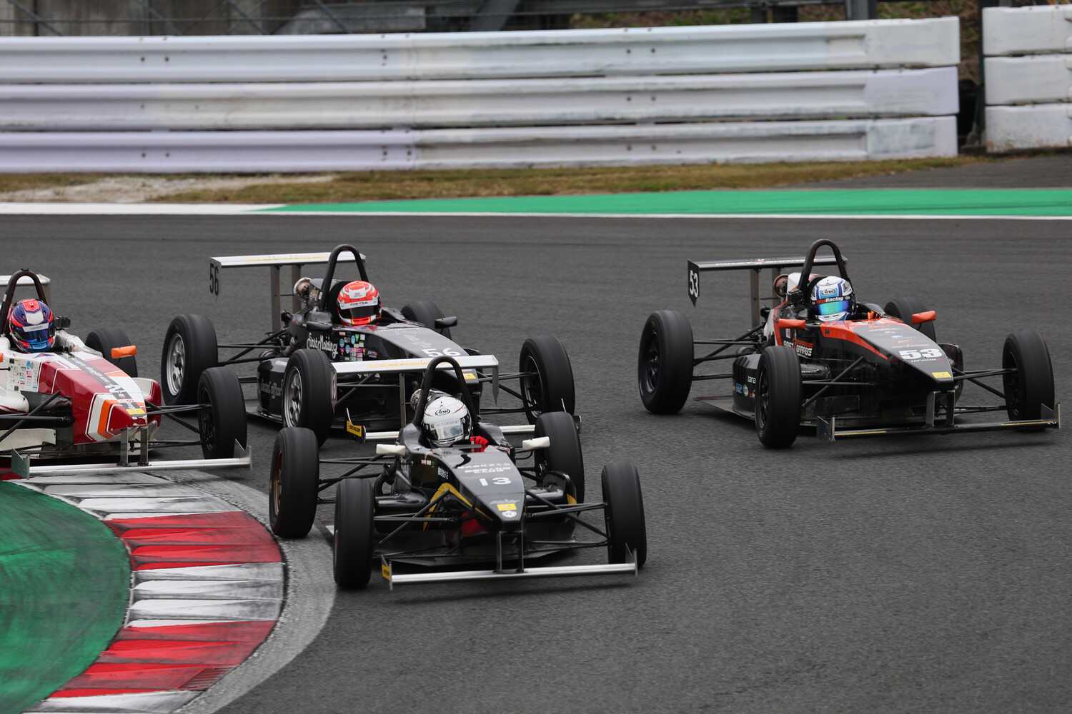 2位に上がった切替だが箕浦の攻めが厳しく防戦一方。ここに濱邊と武者も追いつき4台がトレイン状態で3周目のダンロップコーナーを通過。ストレートに戻ってくると4台が0.8秒以内に連なって4周目へ。ストレートエンドでは切替~箕浦~濱邊が3ワイドになってTGRコーナーへ。ブレーキングでイン側切替、アウトに箕浦がつけてターンイン。濱邊はいったん引いて2台のバトルを見守るが、コーナリングで前2台がややワイドなラインでやりあうスキに仕掛けて箕浦を仕留めて切替に並ぶ。さらに武者も箕浦に先行。一瞬の攻防で箕浦は5位にドロップ。コカ・コーラコーナーでは切替が前で進入するがアウト側のラインでスピードを乗せた濱邊がサイド・バイ・サイドから前に出て100Rへ。しかしアドバンコーナーでは切替がインから差し返して2位を奪い返す。箕浦も武者のインから仕掛けるが、武者が粘って4位を守る。3位に落ちた濱邊だがダンロップコーナーに向けてアウトからブレーキング勝負を挑むとここに武者が割り込んでいく。これで濱邊はディフェンスラインを取らざるを得ず切替を逃がしてしまう。濱邊~武者~箕浦、さらに石井とYOSHIDAまで5台がワンパックになって13コーナーへ飛び込む。パナソニックオートモーティブコーナーではYOSHIDAが石井のインから並んで出口からの加速勝負へ。わずかに石井が前に出てコントロールライン上では0.096秒の差。