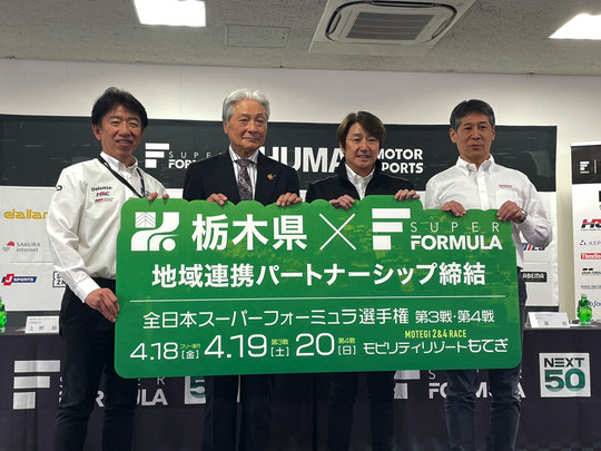 4月18日、スーパーフォーミュラ第3、4戦が開催されている栃木県のモビリティリゾートもてぎにおいて、栃木県と日本レースプロモーション(JRP)の地域連携パートナーシップの締結式が行われた。
