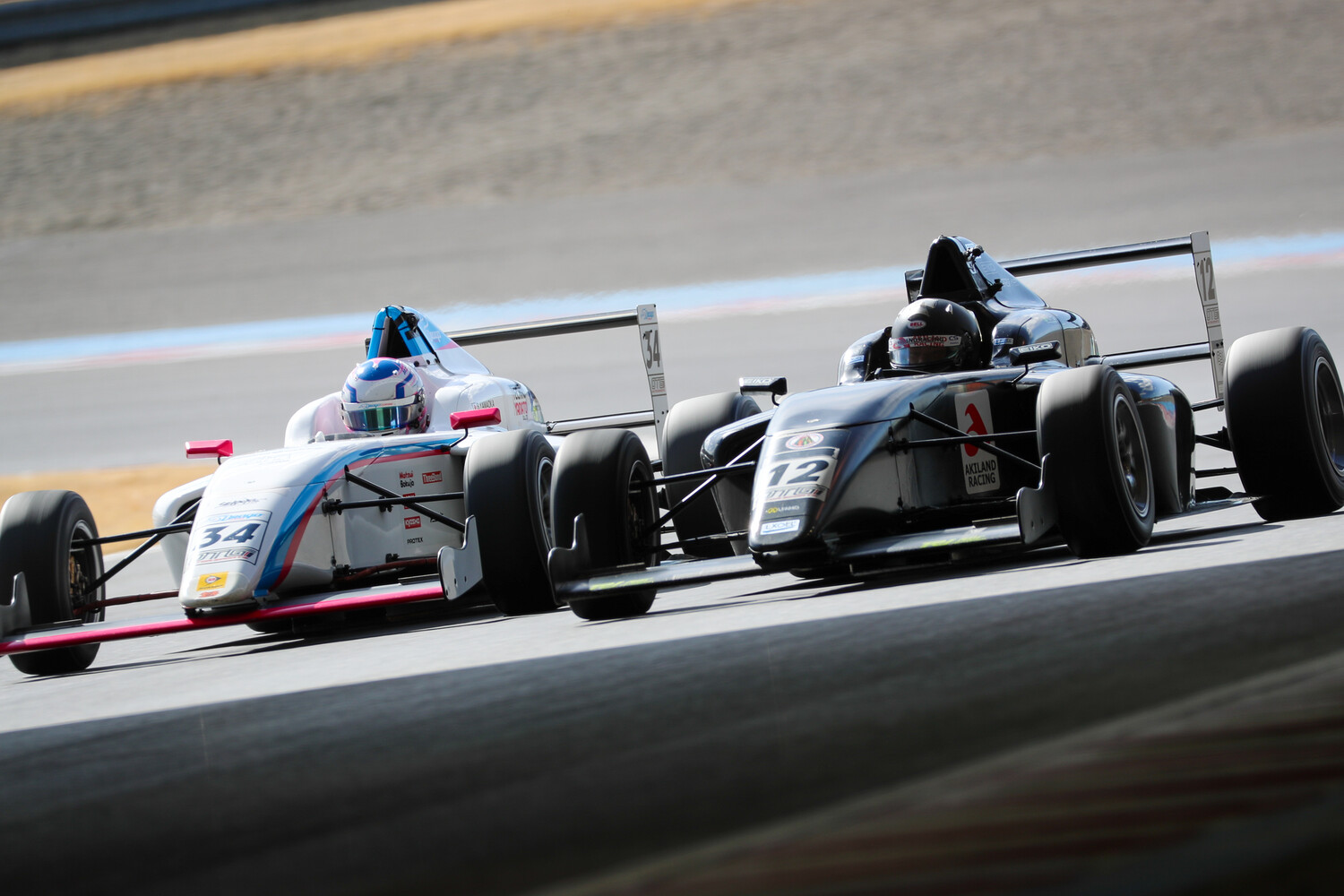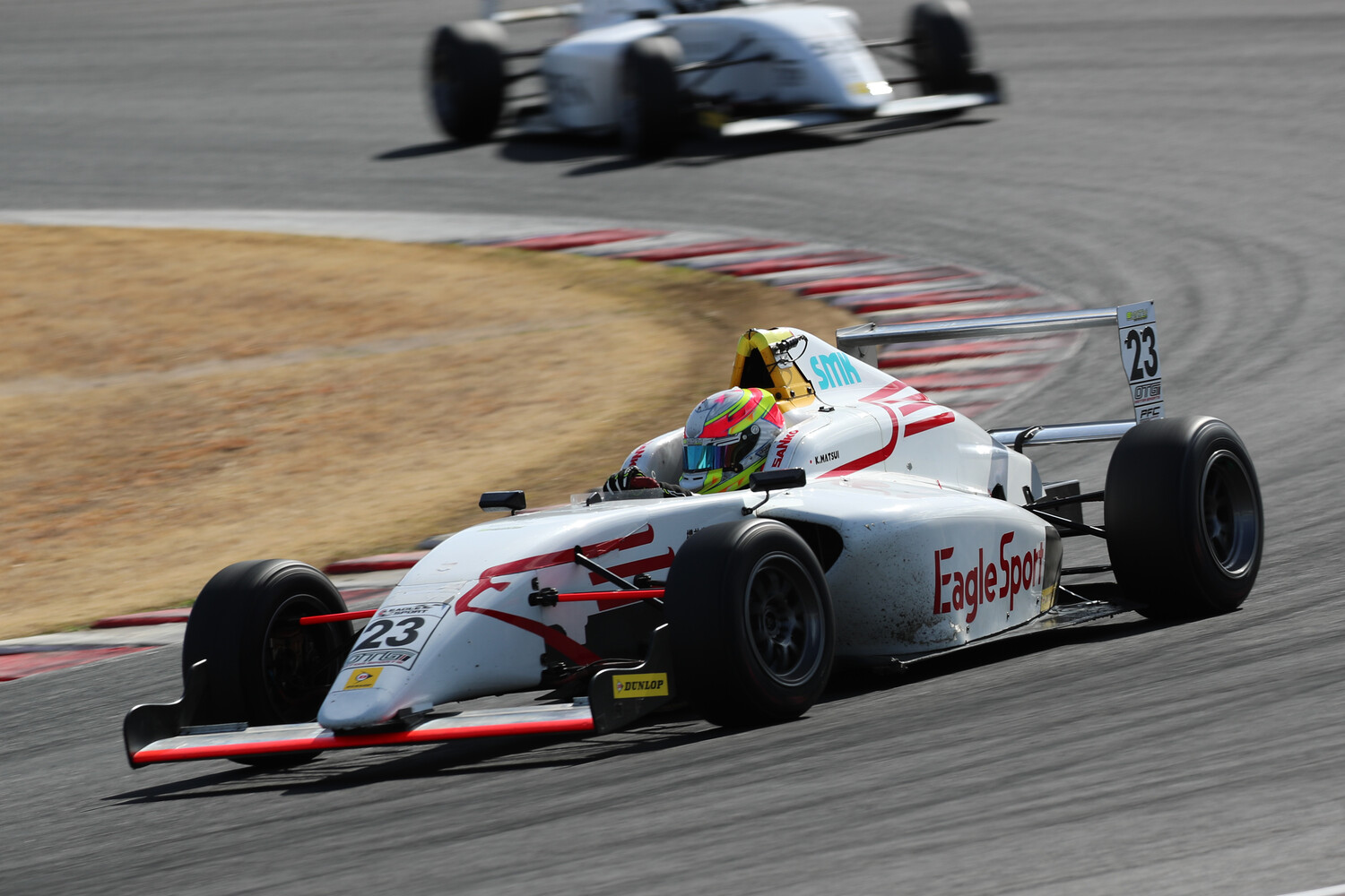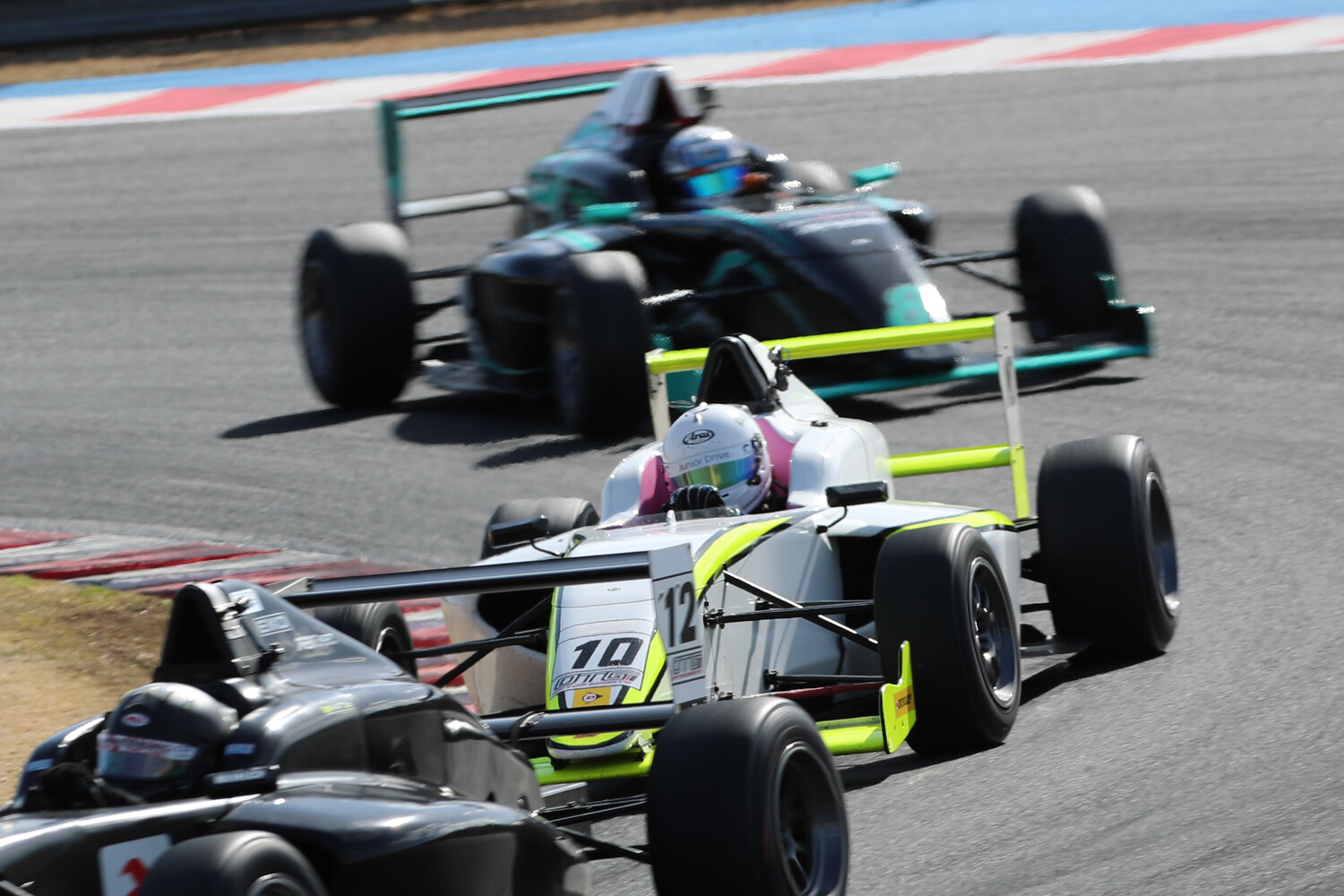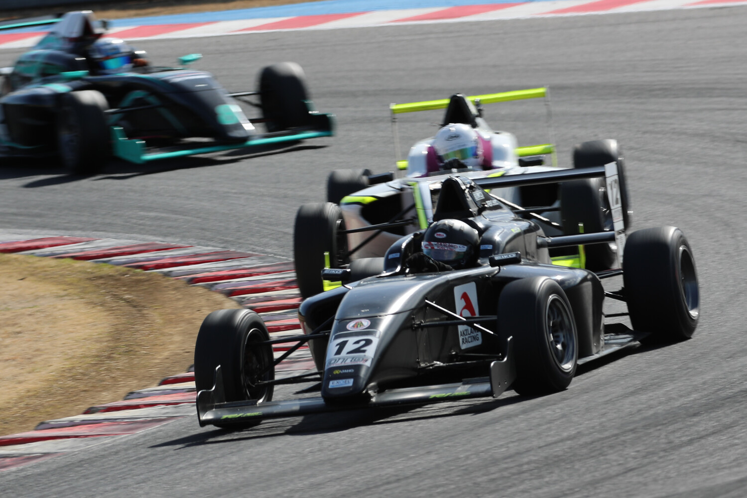 3周目、4周目と小熊は各セクターで全体ベストをマークして2位Lu you Deとの差2.322秒と拡大。1周当たり0.8秒近い差がついている。Lu you Deは逆に3位山岡から0.299秒差と迫られて5周目、山岡は第5コーナーからの立ち上がりでインからLu you Deに並びかけると、サイド・バイ・サイドでファーストアンダーブリッジを通過、130Rでオーバーテイクを完了し、2位の座を奪い取る。この周小熊はさらにギアをあげて1分55秒825のファステストラップで2位に上がった山岡との差を2.959秒まで拡大。そして最下位から追い上げ急な松井は前を行くDanzel Waytan(ダンゼル ウェイタン)(KF MOTORSPORT F110)、伊藤聖七(イヌイ Eagle Sport)、Aire Harun(アイレ ハルン)(Eagle Sport)を次々と仕留めて6位までポジションを戻す。この松井を先頭とした6位グループは随所でバトルを展開。ダウンヒルストレートでは4ワイドになる瞬間もあり、結局松井~Aire Harun~Danzel Waytan~伊藤聖七という順に0.7秒以内のワンパックで走行している。