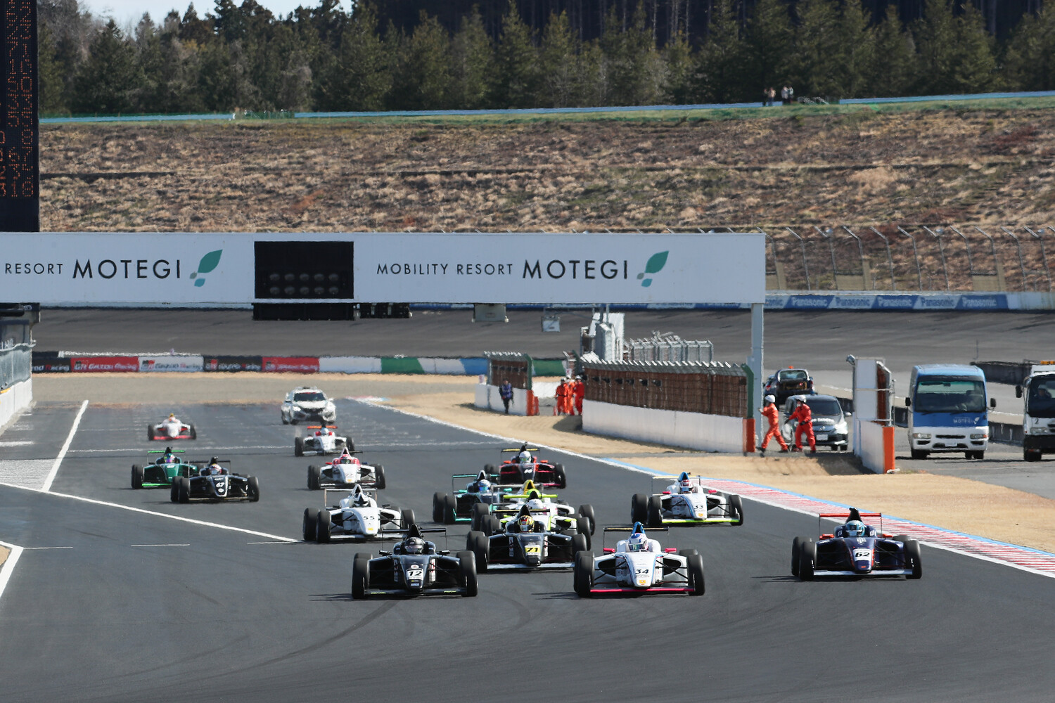17台がエントリーした東⽇本王者決定戦だが、予選でトラブルに見舞われた佐藤佑月樹(KF MOTORSPORT F110)は午後1時40分のコースイン時刻になってもピット内でウマに乗せられた状態でクラッチ交換作業中。さらにグリッドへの試走に出ようとした予選13番手の中井悠斗(KF MOTORSPORT F110)が立ち往生、シフトの不具合ということでピットに押し戻される。結局佐藤はスタートに間に合わず、中井もピットスタートということになり、グリッドには15台のマシンが整列した。