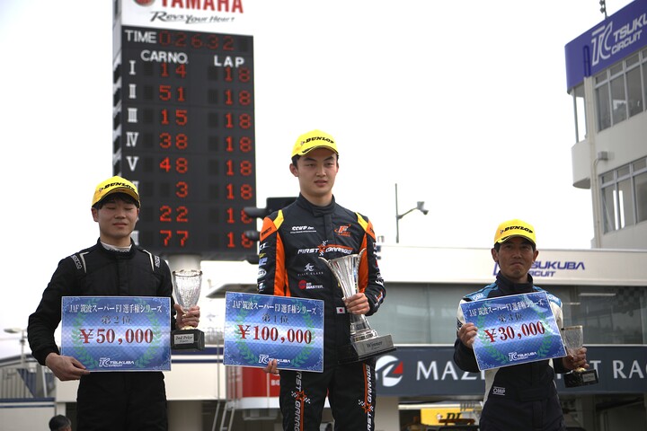 ファイナルラップ、切替は最後のチャンスを求めて第1コーナーから鈴木を攻め立てるが、鈴木もしっかりと守り扉を開けない。トップスピードで勝るS-FJと、ブレーキングとコーナリングが有利と言われるFJ1500。それぞれの特性の違いが間合いの変化に現れるが、筑波では決定的な差にはならず、最後は鈴木が58秒667とこのレースのファステストラップを叩き出して切替を0.802秒差に突き放してトップチェッカー。総合優勝を飾った。切替は2番手に終わったがS-FJクラスでは優勝、3番手相田はS-FJ2位。畠山は4番手でフィニッシュしたが、黒白旗の後にも走路外走行があったということで10秒加算のペナルティが課されて9番手にドロップ。4番手は村上で、ファイナルラップの第2ヘアピンで接触がありフロントウイングを曲げてしまったがそのまま走り切りFJ1500の2位、5番手秋山でS-FJクラス3位、マスターズクラスの優勝となった。6番手内藤はS-FJ3位、FJ1500の3位は7番手フィニッシュのMITSUYAMA。昨年12月のS-FJ日本一決定戦でデビューのはずがクラッシュで欠場、やっと迎えたデビュー戦でクラスは変われど表彰台を獲得した。他のデビュー組も須藤8番手、安西11番手、松本12番手、デワン・クリストファー13番手で無事フィニッシュした。