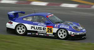 5月3日、恒例のGW決戦となるJGTC第2戦の公式予選1回目が快晴の富士スピードウェ イで行われた。 午前11時30分、予選開始。コースオープン直後は、#39デンソーサードスープラと#62 VemacR&Dダンロップ350R以外は各車様子見の構え。サードは早々に24秒台に入る。公 式練習に引き続いてスープラは好調なようだ。 開始10分程度経過した頃から徐々にコースインする車が増え始め、タイムアタック合 戦が本格的に始まった。開始から18分、#38auセルモスープラが1分23秒986のコースレ コードをたたき出す!#38は更にタイムを1分23秒969までタイムを削りとった。 11時50分からはじまったGT300クラスの走行時間帯では、まず#11ダンテールフェラー リF360がトップタイムを出し、#43ガライヤがそれに続く。7分後、Aコーナーで#17、 #19の2台のMR-Sがコースアウト。これを回収するため最初の赤旗が出る。 約10分のインターバルの後、予選は再開されたが、5分経過したところで#19ウェッズ スポーツMR-Sが100Rでクラッシュ、コース上に停止したため再度赤旗が出された。一 時は救急車が出るなどドライバーの安否が心配されたが、青木孝行選手は軽い脳震盪 で済んだ模様。しかしクルマの方はかなり破損しており、午後の予選に参加できるか 微妙な状況だ。 12時30分、予選再開。10分後にGT500との混走となるも、タイムアップするクルマは なく、13時で予選1回目は終了した。 GT500は、コースレコードを出した#38auセルモスープラがトップ。さらに上位6台ま でをスープラが占めた。 GT300は、#26PLUS e タイサンアドバンGT3Rが1分32秒334でトップ。TIに引き続いて ここでも好調を印象付けた。2位は#9正義の味方 覆面レーサーX MTが入った。 ◆富士スピードウェイ http://www.fujispeedway.co.jp/