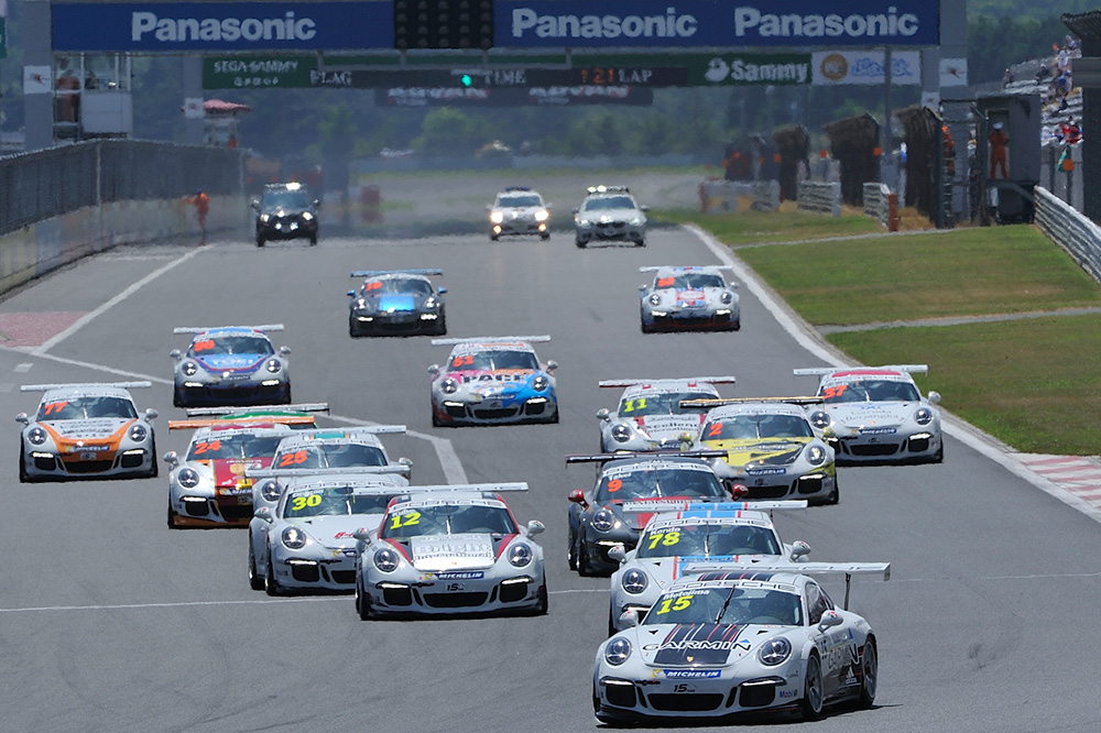ポルシェ カレラカップ ジャパン(PCCJ)2015 第8戦ミシュランチャレンジ決勝が8月9日(日)、富士スピードウェイ(静岡県)で開催された。この日の富士は朝から強い陽射しで、気温、路面温度とも上昇。容赦ない暑さが、スターティンググリッドで決勝スタートを待つドライバーたちを襲っていた。